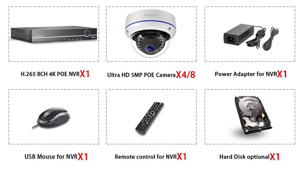 1 сетевой видеорегистратор H.265 8CH 4K POE NVR;4/8 X H.265 HD POE аудио 5MP IP Крытый Открытый ИК День ночного видения Водонепроницаемый купол камеры;1 x Блок питания для NVR;1 х USB мышь для NVR;1 компакт-диск программного обеспечения для NVR;1 пульт дистанционного управления для NVR;Жесткий диск опционально!