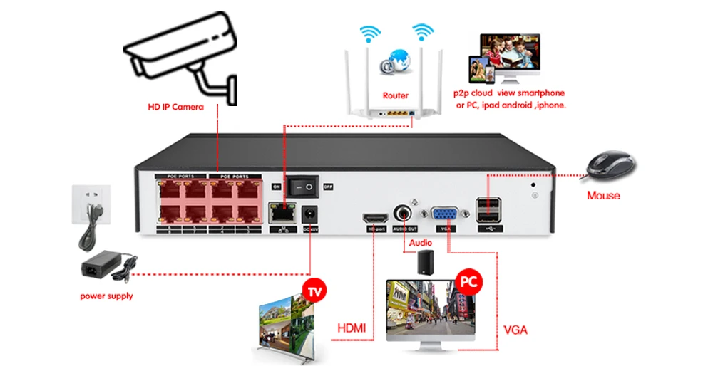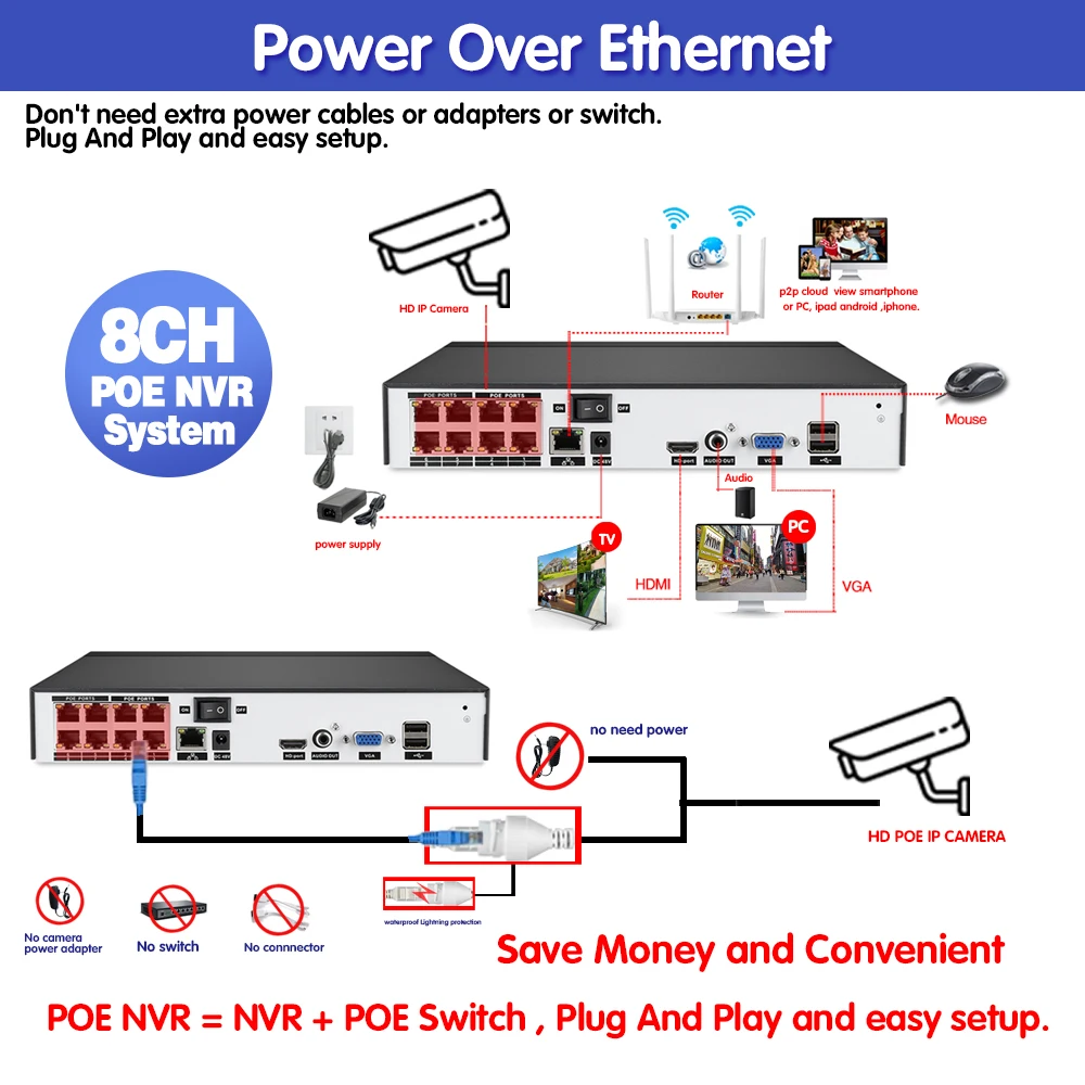 Нет дополнительных кабелей питания или адаптеров, просто подключив ip-камеру к NVR с помощью одного кабеля, вы можете легко завершить установку без знания о компьютере или сети и начать наслаждаться супер простым мониторингом среди вашего смартфона, планшета или ПК.Экономьте деньги и удобный POE NVR = NVR + POE коммутатор, подключи и работай и простая настройка!