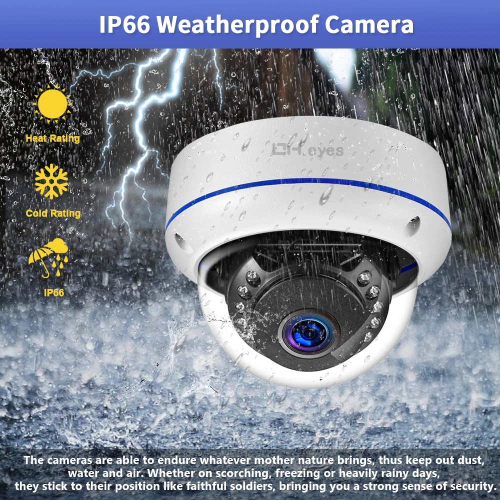 Используйте их в качестве наружных камер или крытых камер, так как они построены жестко, выдерживает любую погоду: дождь, снег, пыль и жаркие дни. С защитой от атмосферных воздействий IP66 и кабелями, просвечивающимися через подставку для защиты, гарантируем, что вы сможете ответить на их производительность, день в день. Наша камера имеет сверхпрочный металлический корпус, профессиональный IP66, устойчивый к атмосферным воздействиям, обеспечивая стабильную производительность как внутри, так и снаружи.