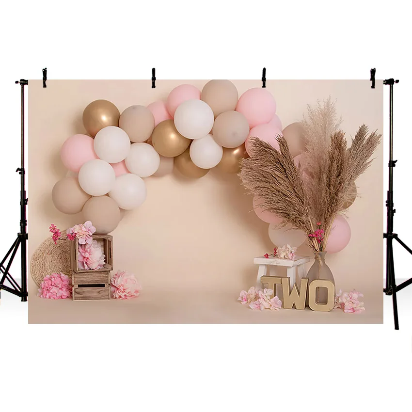 Фон для вечеринки в честь 2-го дня рождения с розовыми воздушными шарами и цветами в стиле бохо тростник фон для фотосъемки для фотостудии декор для торта