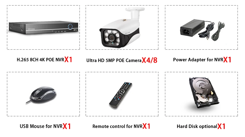 1 сетевой видеорегистратор H.265 8CH 4K POE NVR;4/8 X H.265 HD POE аудио 5.0MP IP Крытый Открытый ИК дневное ночное видение атмосферостойкие пулевые камеры;1 x Блок питания для NVR;1 х USB мышь для NVR;1 компакт-диск программного обеспечения для NVR;1 пульт дистанционного управления для NVR;Жесткий диск опционально!