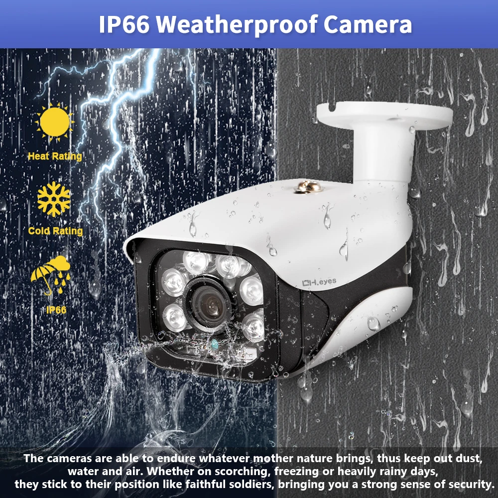 Используйте их в качестве наружных камер или крытых камер, так как они построены жестко, выдерживает любую погоду: дождь, снег, пыль и жаркие дни. С защитой от атмосферных воздействий IP66 и кабелями, просвечивающимися через подставку для защиты, гарантируем, что вы сможете ответить на их производительность, день в день. Наша камера имеет сверхпрочный металлический корпус, профессиональный IP66, устойчивый к атмосферным воздействиям, обеспечивая стабильную производительность как внутри, так и снаружи.