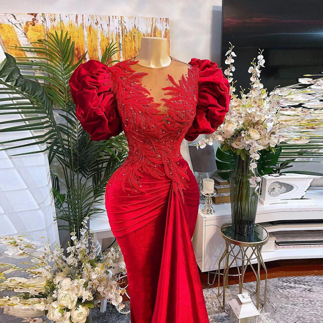 Красные вечерние платья с пышными рукавами в стиле русалки, вельветовые платья с прозрачной горловиной для официальной вечеринки в арабском стиле Aso Ebi, женская одежда для выпускного вечера
