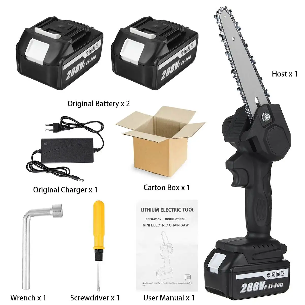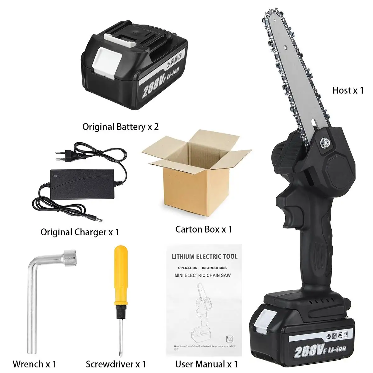 Посылка включает в себя:Тип A1 Электрическая цепная пила батареи1 отвертка1x аксессуарыАккумулятор-1 шт.1 х адаптер питания (вилка стандарта США)1 х РуководствоТип B1 Электрическая цепная пила батареи1 отвертка1x аксессуары2 батарейки1 х адаптер питания (вилка стандарта США)1 х РуководствоТип C1 Электрическая цепная пила батареи1 отвертка1x аксессуарыАккумулятор-1 шт.1 х адаптер питания (штепсельная Вилка европейского стандарта)1 х РуководствоТип D1 Электрическая цепная пила батареи1 отвертка1x аксессуары2 батарейки1 х адаптер питания (штепсельная Вилка европейского стандарта)1 х РуководствоСпецификация:-Материал: АБС-пластик-Материал цепи: Высокоуглеродистая сталь-Размер: 40х19х16 см-Цвет: черный-Длина направляющей: 6 дюймов