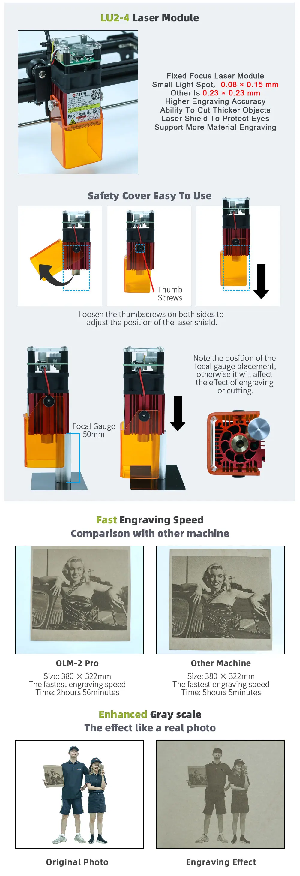 Бренд: OrturНомер модели: Laser Master 2 proТип: лазерная гравировальная машинаМатериал: алюминий + сталь с порошковым покрытиемМощность лазера: LU2-4 лазерный модуль с сжатым фокусным расстоянием 20 Вт (электрическая мощность: 20 Вт, Сила света: 5000-5500 МВт)Дальность достижения лазера: 445 ± 5 нмПитание: адаптер питания 24 В 2 А