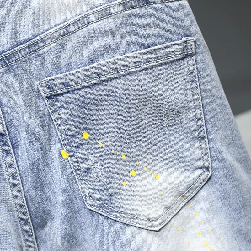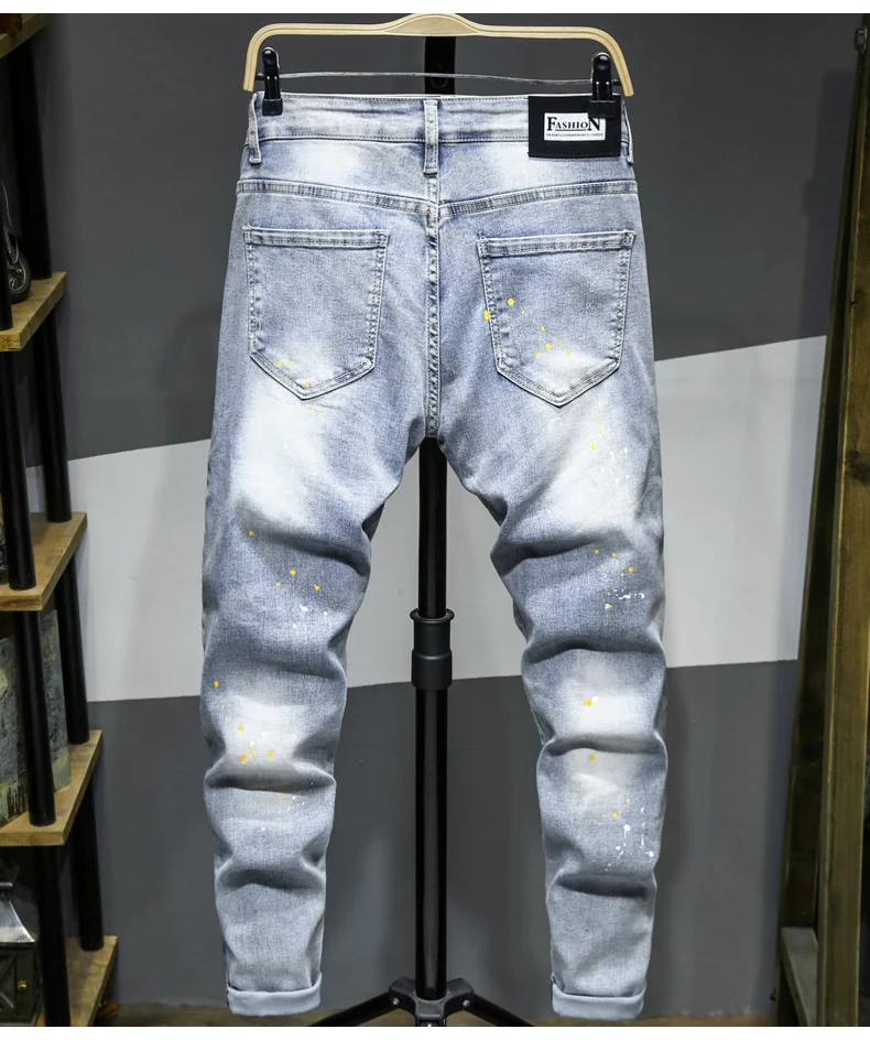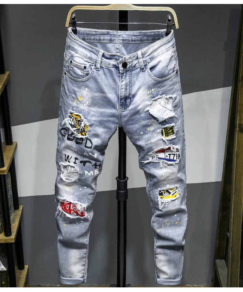 Джинсы мужские рваные зауженные с граффити, Модные зауженные брюки из денима с алфавитным принтом, Модная молодежная одежда в стиле хип-хоп, рок