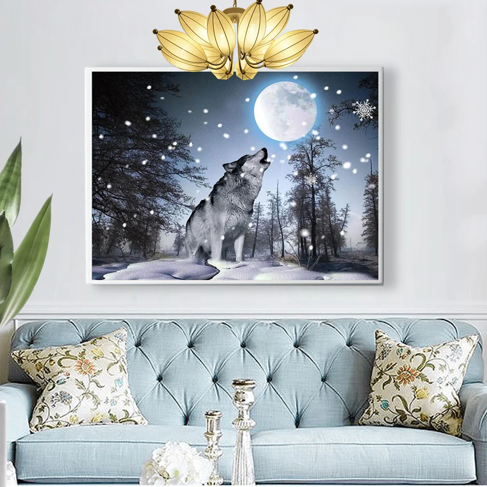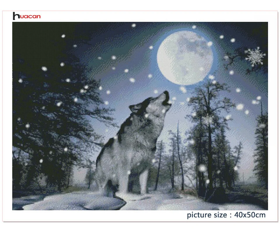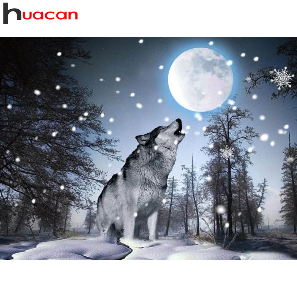 Алмазная живопись Huacan, стикеры на стену с изображением волка, Луны, вышивка крестиком, дерева, снега, мозаика, Декор для дома