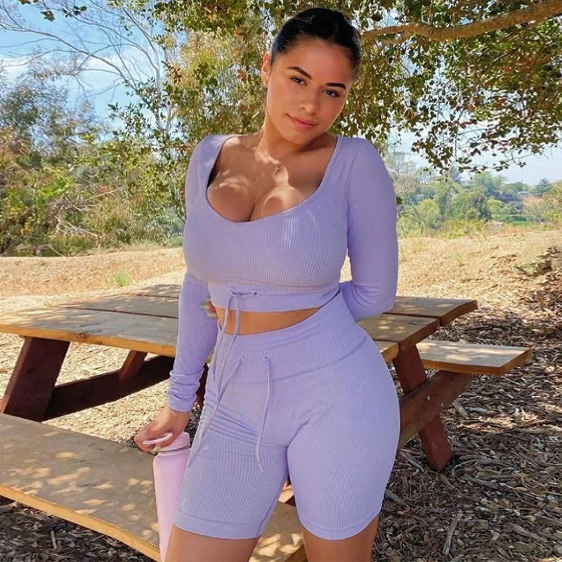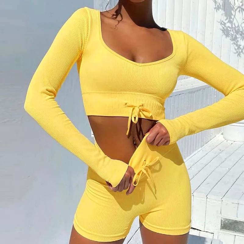 Летний женский комплект из двух предметов, корректирующий фигуру укороченный топ с длинным рукавом + велосипедные шорты, женский спортивный костюм
