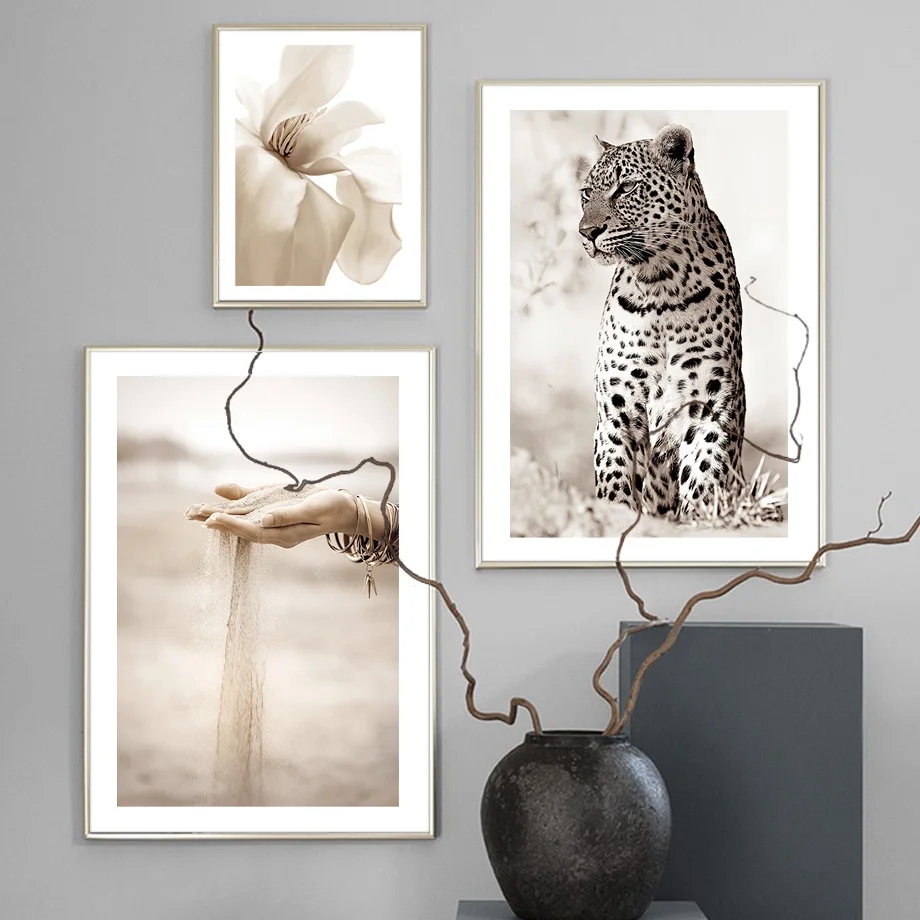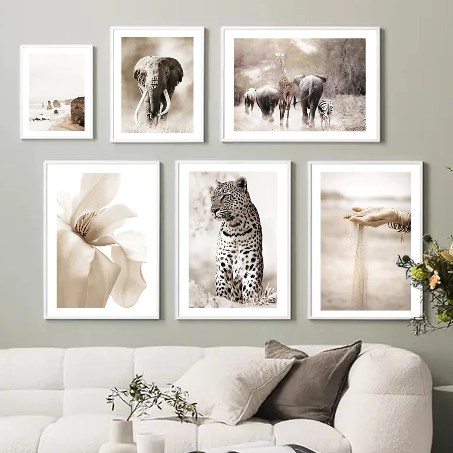 Бежевый цветок, пляжный песок, слон, леопард, настенная живопись, холст, скандинавские постеры и принты, настенные картины для декора гостиной