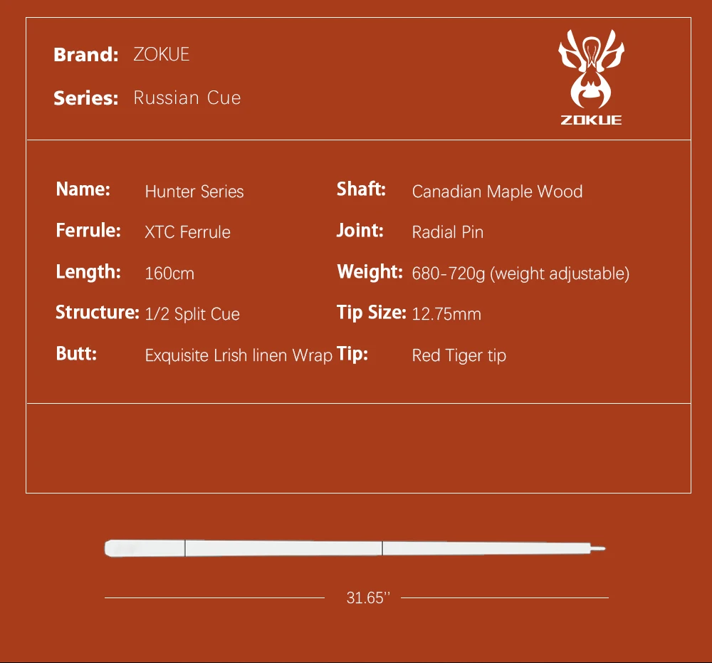 Бильярдный Кий ZOKUE, 160 см, 12,75 мм, радиальный штифт, подборка,...