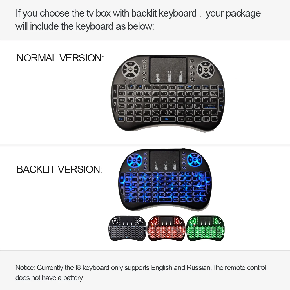 Если вы покупаете ТВ коробка с 7-цветная подсветка клавиатуры, в посылка, вы можете получить I8 клавиатуре, которые поддерживают на английском и русском языках следующим образом: (имеются соответствующие символы на клавишах) способ работы: 1. Подключите usb-датчик к usb-порту компьютера, телевизора или приставки Android; 2. Подождите 20-30 секунд для сопряжения системы; 3. Используйте клавиатуру удаленно 4. FN + F2 для открытия и переключения цвета подсветки Примечание: сама клавиатура не имеет аккумулятора, пожалуйста, поместите его в батарею AAA