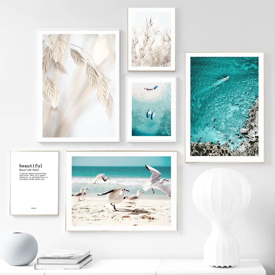 Пальмовое дерево пляж; Морские волны Чайка указатель Wall Art Холст...