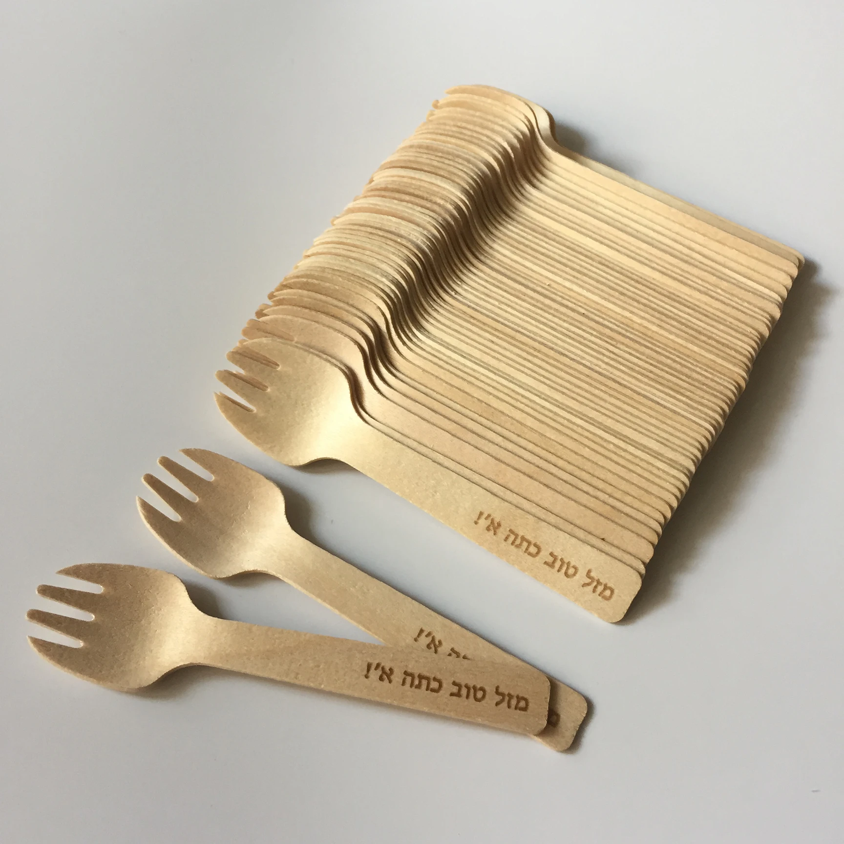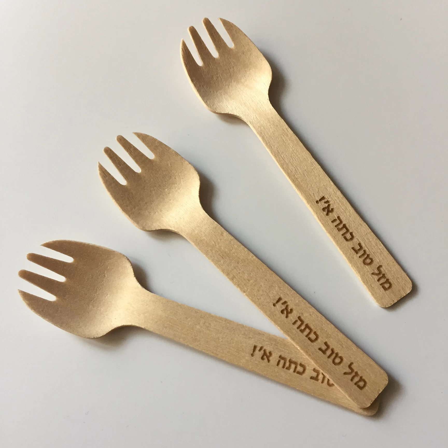 100 шт на заказ Выгравированные мини-вилки из натурального дерева на иврите, вечерние торты, десерты, дегустация мороженого