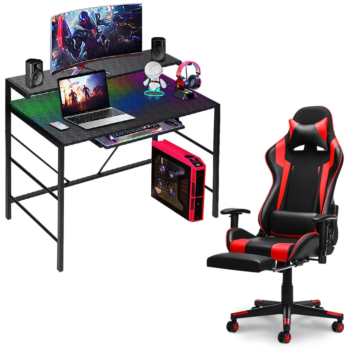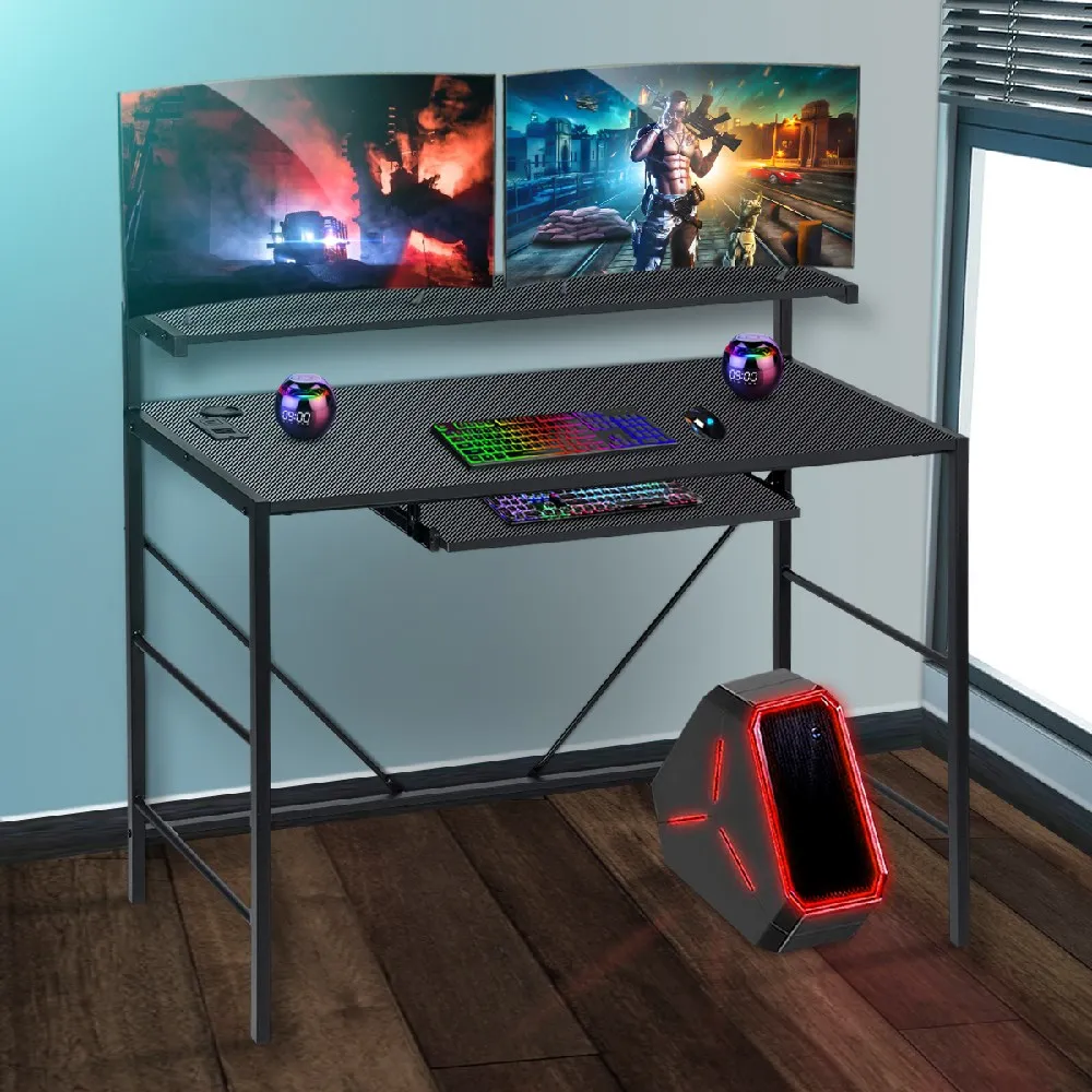 Игровой Настольный ПК с RGB светодиодный, двухуровневый настольный компьютер из углеродного волокна, игровой Офисный Компьютерный стол с подставкой для монитора, офисный стол