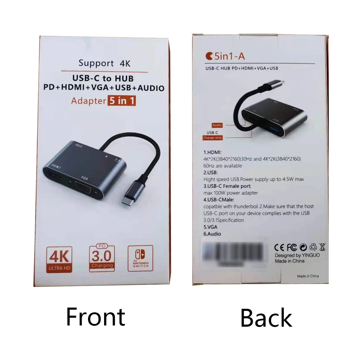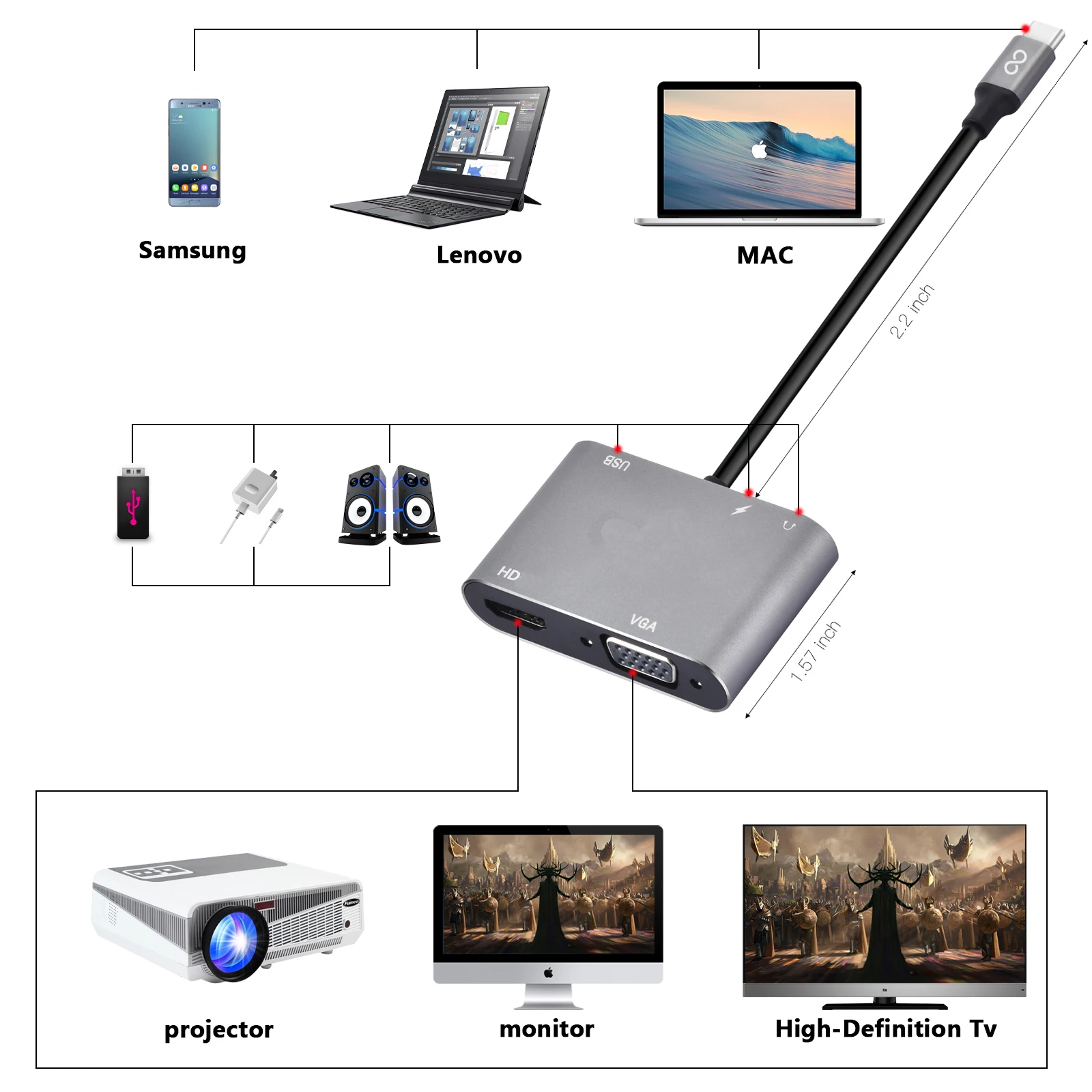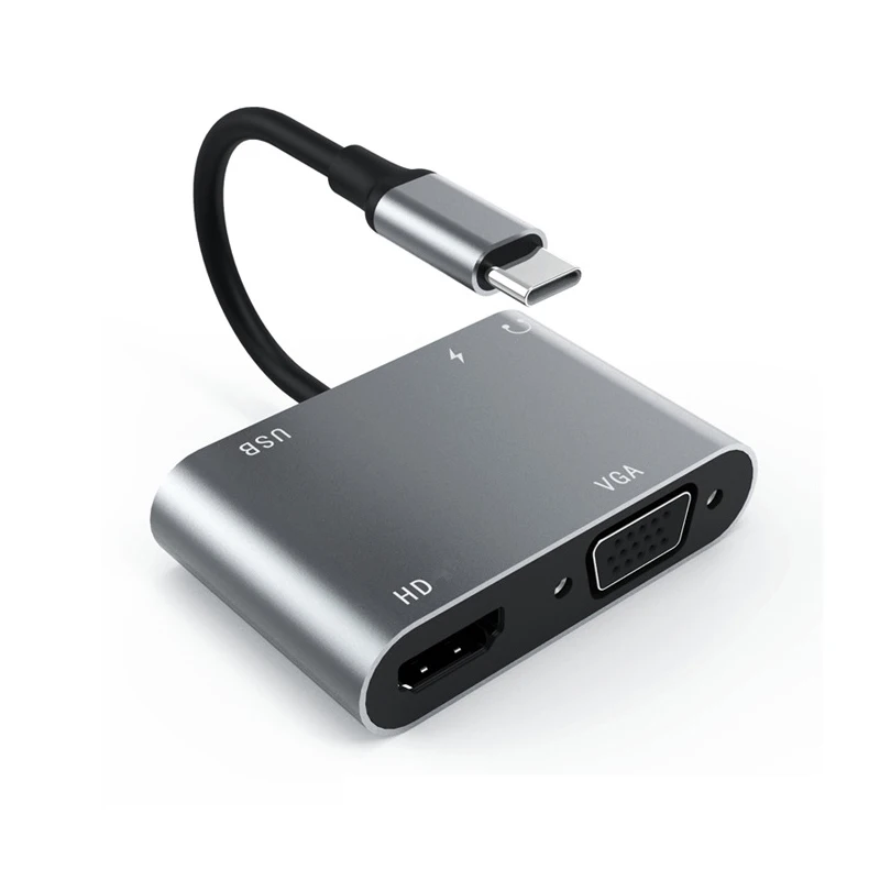 【Все в одном 】 Расширьте свой usb-порт на HDMI, VGA выход, аудиовыход, USB 3,0 и usb-c порт для зарядки. Подключите устройства, оснащенные разъемом Type-C, к дисплеям HDMI и VGA, а также подключайте стандартные usb-устройства и USB-C кабели для зарядки.【HDMI и VGA порт 】 HDMI порт Макс sup порт 4K UHD 3840 × 2160 @ 30 Гц или VGA дисплей до 1080P @ 60 Гц Full HD. Когда два порта работают одновременно, максимальное разрешение двух составляет 1920x1080P @ 60 Гц. Примечание: режим расширения, когда vga и hdmi работают в то же время. Tw o мониторы показывают те же изображения.USB3.0 и передача аудио] поддержка USB 3,0 сверхвысокоскоростная (5 Гбит/с) передача, обратная совместимость с USB2.0. Подключите клавиатуру, мышь, HDD, флэш-накопитель или usb-кабель и другие устройства для синхронизации и зарядки смартфонов или других устройств, передачи аудио в одном направлении или передачи синхронизации VGA, вы можете связать гарнитуры, гарнитура микрофонов и других устройств!【PD зарядка 】 зарядный порт c-типа может обеспечить питание до 100 Вт для ноутбука с usb-питанием и обеспечить дополнительную мощность жесткого диска. DVD драйвер и аксессуары подключаются к usb-порту одновременно. (Не подходит для Apple SuperDrive)【Широкая Совместимость: 2015/16/17/18 MacBook/MacBook Pro, iPad Pro 2018, Macbook air 2018, Surface Book,Google Chromebook Pixel,Dell XPS 12/13/15, HP Spectre X2/X360, acer Spin7, Samsung S8/S9 + и многое другое. Перед покупкой, пожалуйста, обратитесь к списку совместимости.Usb-c концентраторы 5 портовС разъемом usb 3,0, hdmi, vga, аудио, usb-c.Этот адаптер станет отличным дополнением для вашего USB-C нового ноутбука. С помощью этого адаптера вы можете передавать/передавать видео на монитор/проектор/Телевизор с портом HDMI/VGA с вашего ноутбука/. И вы можете использовать очень быстрые порты usb 3,0 для подключения клавиатуры, мыши, жесткого диска к новым usb c latops, два удобных SD и TF кардридера для фотографа, usb-c женский порт для пропуска питания. Пожалуйста, проверьте следующий список уплотнений:Разрешение HDMI до 4K @ 30h, вниз совместим с 2K, 1080P, 1080I, 720PРазрешение VGA до 1080P @ 60 Гц, вниз совместим с 1080I, 720PИспользуйте только порт HDMI или VGA для одного монитора. Поддерживает зеркало и расширенный режим. Поддержка HDMI 4K @ 30Hz и VGA поддержка 1080PИспользуйте HDMI и VGA вместе для 2 мониторов. Поддерживает только режим зеркала. 2 монитора будут дублировать друг друга. Максимальное разрешение 1080P