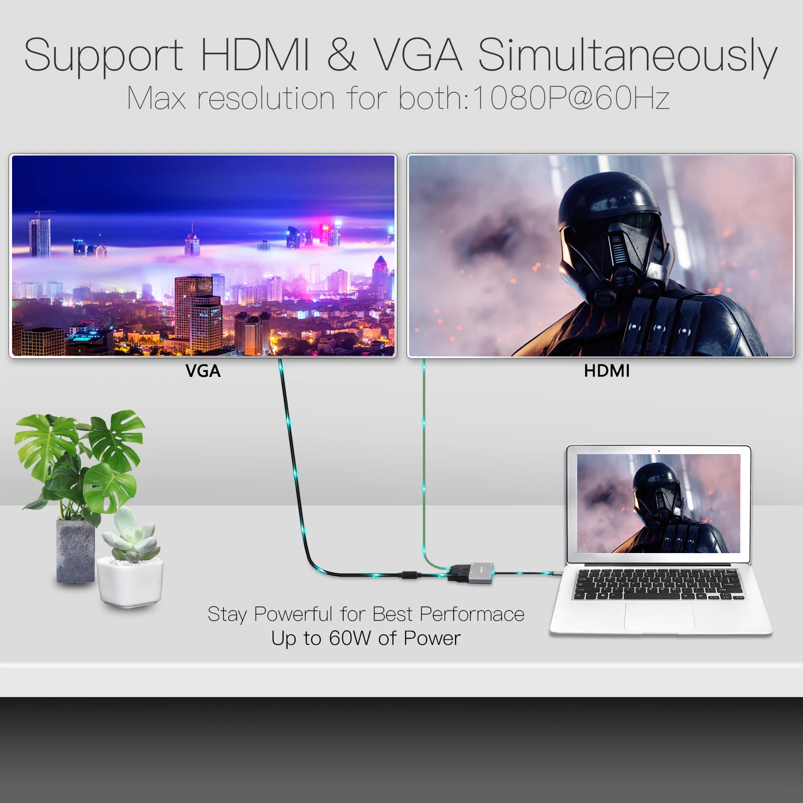 Параметры интерфейсаHDMI порт 1 * HDMI 4K @ 60Hz/@ 30Hz,VGA порт 1*1080P @ 60Hz,USB 3.0 порт 1 * USB3.0 до 5Gbp/s, 3,5 мм аудио порт 1 * микрофон/динамик, USB-C сквозная Зарядка 1*100 Вт зарядкаHDMI-VGAИспользуйте USB C адаптер HDMI порт и VGA двойной 4K зеркалирование или расширение экрана, и непосредственно поток 4K UHD или Full HD 1080P видео к HDTV, монитор или проектор для визуального праздника, похожего на кино.Быстрая передачаПередача всего фильма за считанные секунды, даже одновременное подключение нескольких устройств. 98% клиентов, которые говорят о скорости передачи, удовлетворены производительностью адаптера VAVA USB C.5 в 1 мульти-соединениеАдаптер может быть подключен к мобильным телефонам для зарядки или проекции, HDMI и VGA для подключения к мониторам, 3D проекторам, игровым консолям Nintendo и USB3.0.Смарт-дисплей 4KДок-мониторы, смартфоны, синхронизация интерфейсов мобильный телефон, воспроизведение фильмов, обучение онлайн-урокам, игра в игры и т. Д.!Мощная сквозная зарядкаПорт USB-C поддерживает сквозную зарядку до 100 Вт (минус 15 Вт для работы), позволяет заряжать ноутбук на высокой скорости, сохраняя полную функцию других портов концентратора. (Настенное зарядное устройство в комплект не входит)3D проекцияПодходит для HDMI-VGA проекции во время встречи. Продукт маленький и изысканный, прост в использовании! Одновременно используются несколько интерфейсов.
