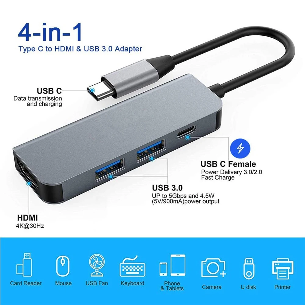 4 в 1 многофункциональная: Этот Тип-C кабель поставляется с USB-C для зарядки, 2 порта USB 3,0 и 4k порт для HDMI, который легко расширяет ваши устройства USB C и выполняет ваше ежедневное использование.