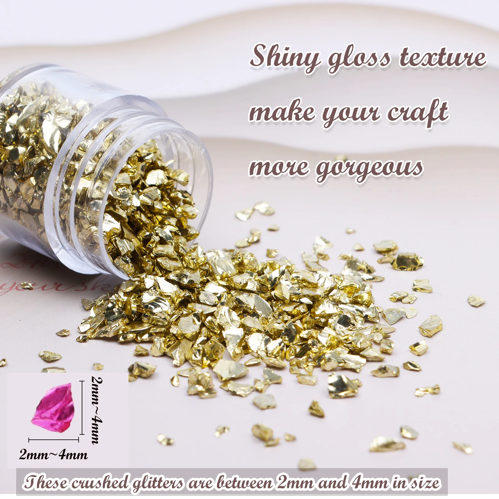 · Блестящая и безопасная: высококачественная металлическая окраска, выглядит блестящим на внешнем виде под светильник, не выцветает и не окисляется. Блестящая блестящая текстура сделает ваш продукт более великолепным. Все Блестки из измельченного стекла обработаны тупым краем, без острых краев, безопасны в использовании.