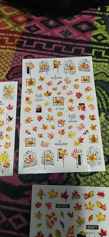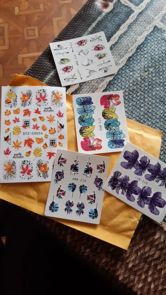 качество дерьмо, плотные наклейки, на ноготь ложаться еле еле,с заломами, закрепила топом для слайдеров и топом без липкого слоя, через два дня отклеилось