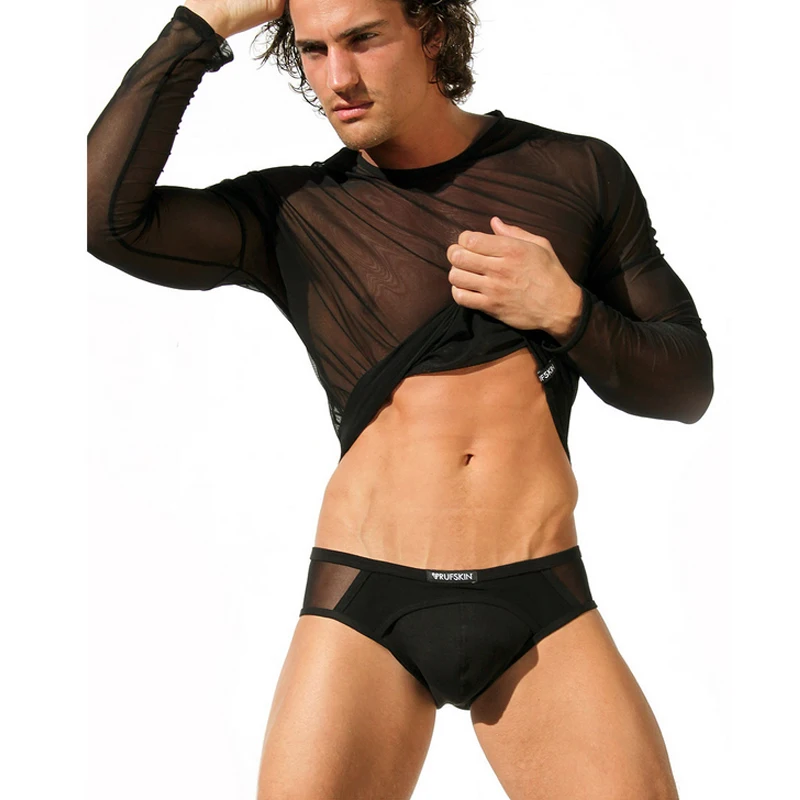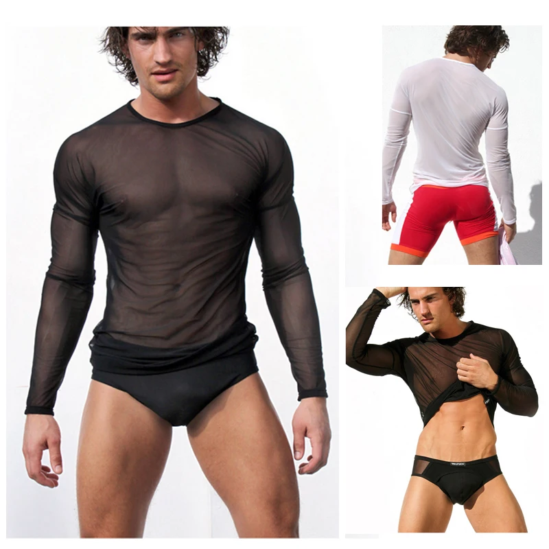 Мужская сексуальная прозрачная рубашка, майка, одежда для геев, нейлоновая сетчатая рубашка, прозрачная футболка с длинным рукавом, Повседневная облегающая футболка