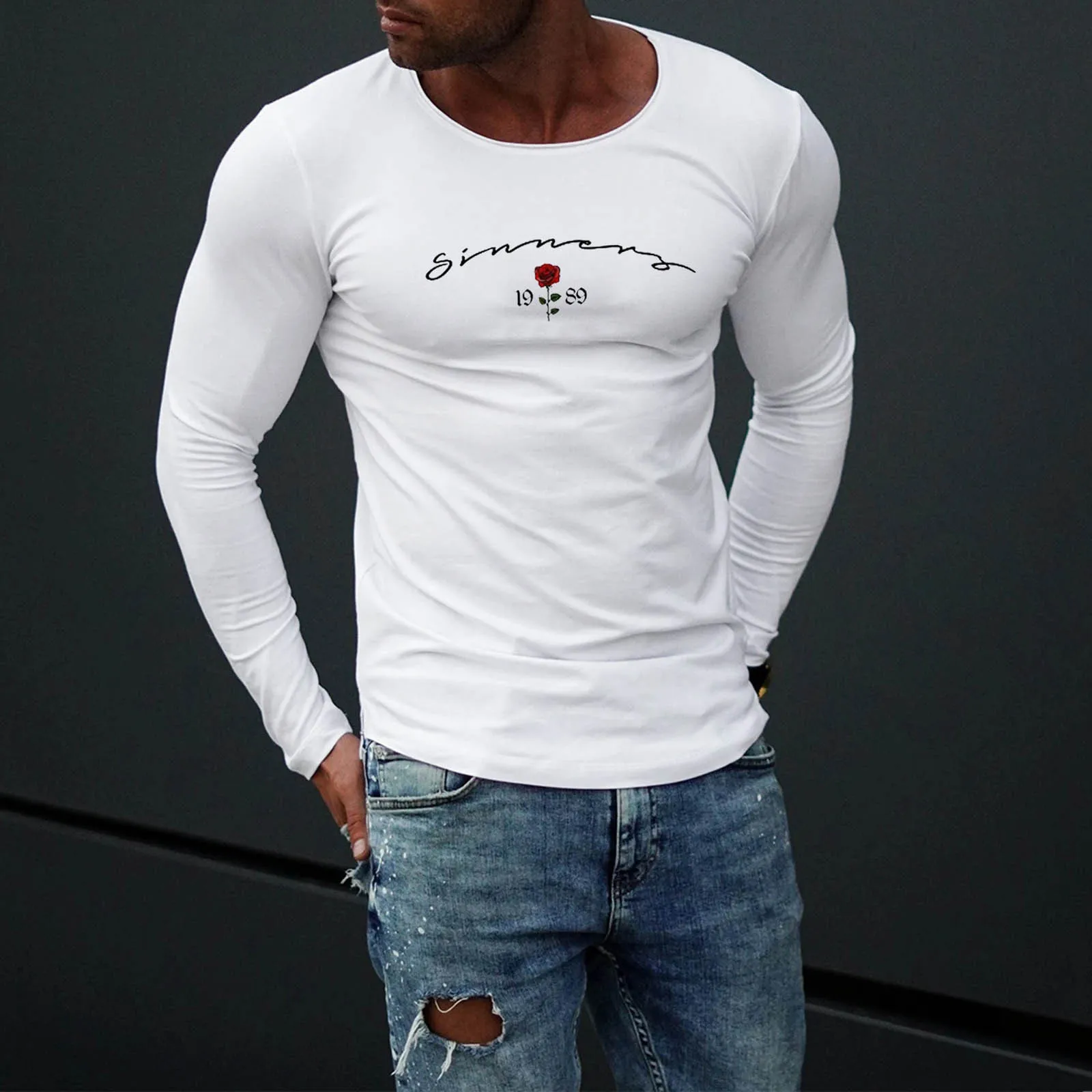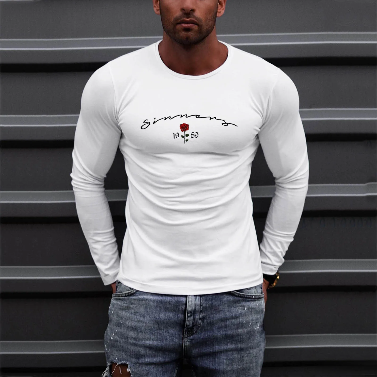 Мужская футболка в стиле 90-х, с принтом красных роз, с длинными рукавами, летняя и осенняя, тонкая, повседневная, с круглым вырезом, топ, блузка, Простые Топы