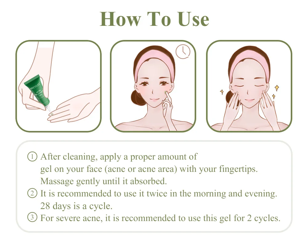 1. После очистки нанесите необходимое количество геля на лицо (область акне или акне) кончиками пальцев. Мягко массируйте, пока не впитывается. 2. Рекомендуется использовать его дважды утром и вечером. 28 дней-это цикл. 3. При сильном акне рекомендуется использовать этот гель в течение 2 циклов.
