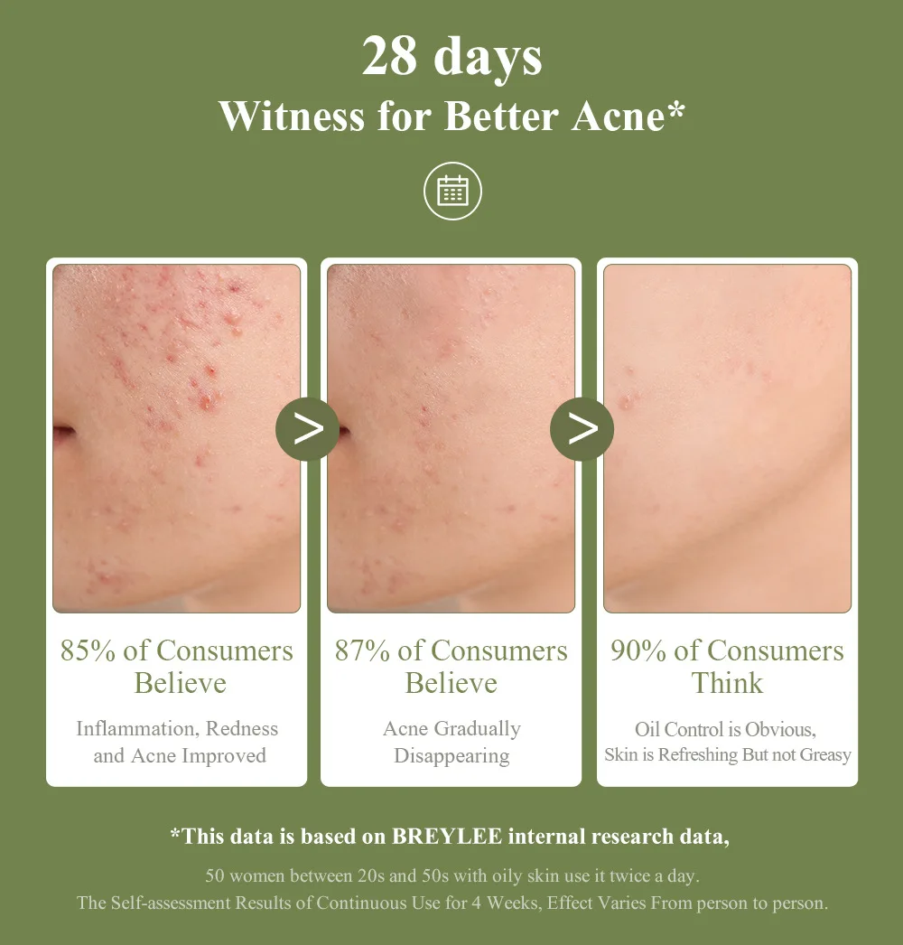 85% потребителей считают, что воспаление, покраснение и акне улучшаются. 87% потребителей считают, что акне постепенно исчезают. 90% потребителей считают, что контроль жирности очевиден, кожа освежает, но не жирная. * Эти данные основаны на внутренних исследованиях BREYLEE, 50 женщин в возрасте от 20 до 50 с жирной кожей используют их два раза в день. Результаты самооценки непрерывного использования в течение 4 недель, эффект варьируется от человека к человеку.
