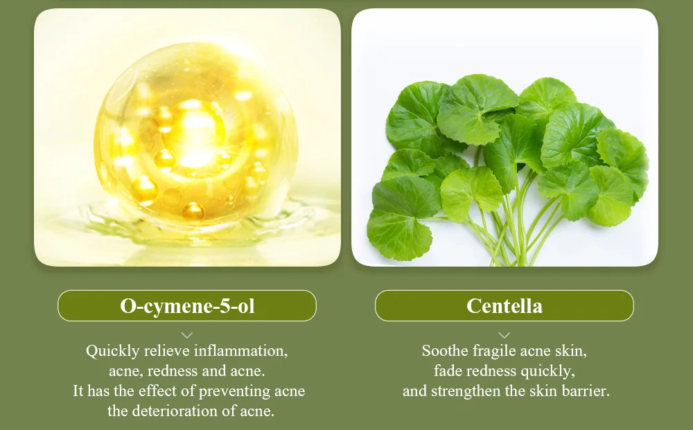 1. Австралийское чайное дерево-эффективное антибактериальное и противовоспалительное, делает акне зрелыми быстро и устраняет упрямые акне. 2. Салициловая кислота, признанная FDA в качестве эффективного антиакне ингредиента, растворяет масло, легко проникает в дно кожи, Очистите поры, избавьтесь от прыщей без припухлости. 3. O-cymene-5-ol-быстро снимает воспаление, акне, покраснение и акне. Это помогает предотвратить появление акне. 4. Центелла-успокаивает хрупкую кожу от акне, быстро выцветает и укрепляет кожный барьер.