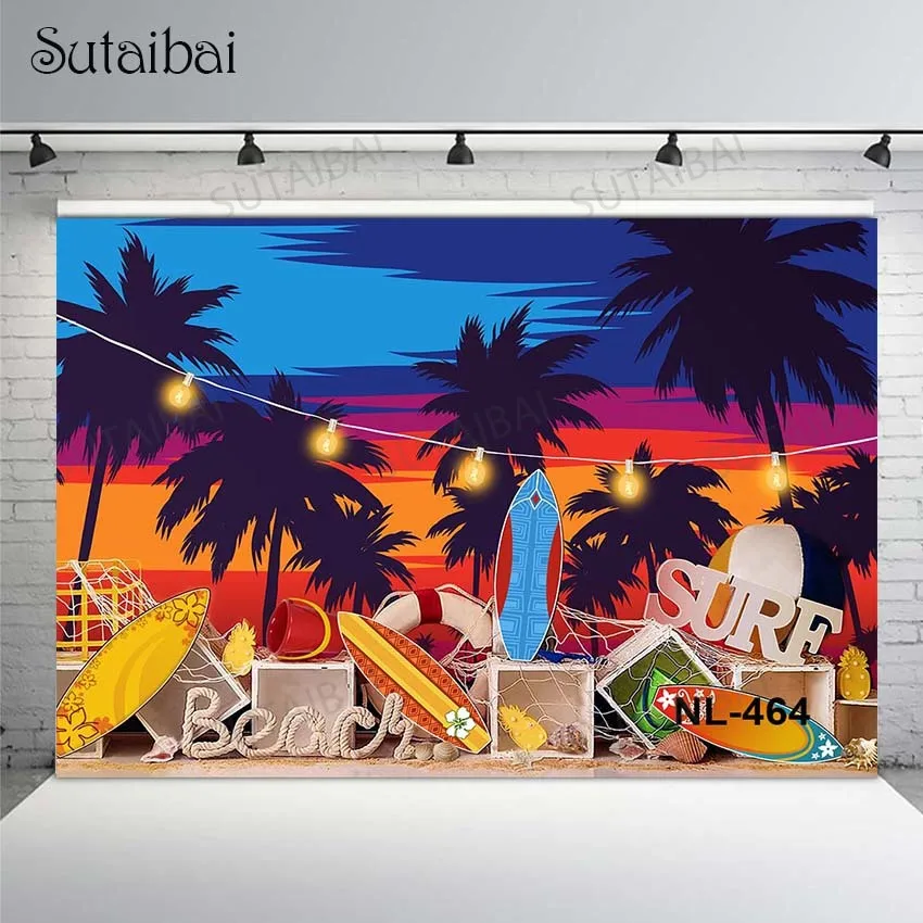 Фон для студийной фотосъемки с изображением летнего пляжа, доски для серфинга, пальмы, раковины, детей
