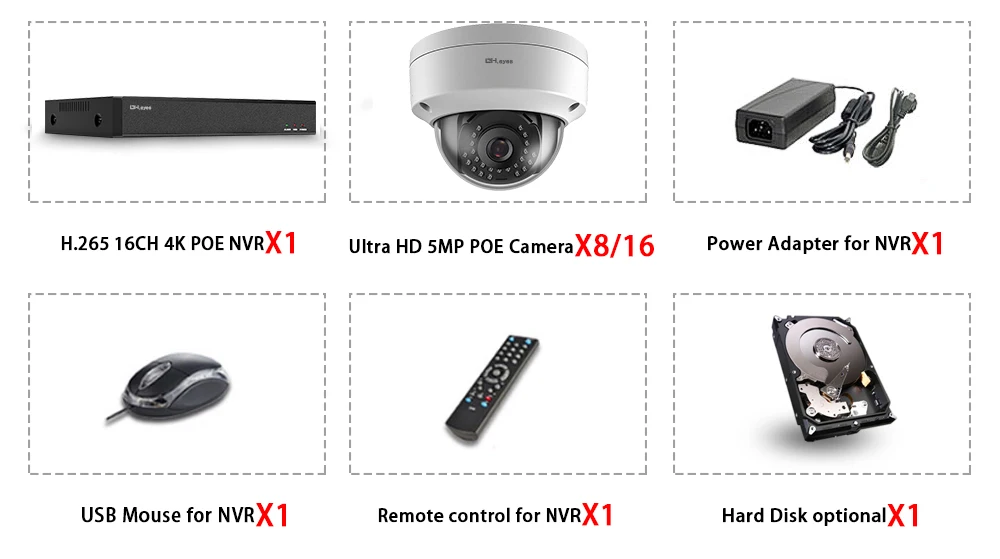 1 сетевой видеорегистратор H.265 16CH 4K POE NVR;8/16 X H.265 HD POE 5.0MP IP Крытый Открытый ИК День ночного видения Водонепроницаемый купол камеры;1 x Блок питания для NVR;1 х USB мышь для NVR;1 компакт-диск программного обеспечения для NVR;1 пульт дистанционного управления для NVR;Жесткий диск опционально!