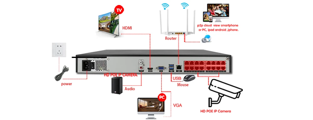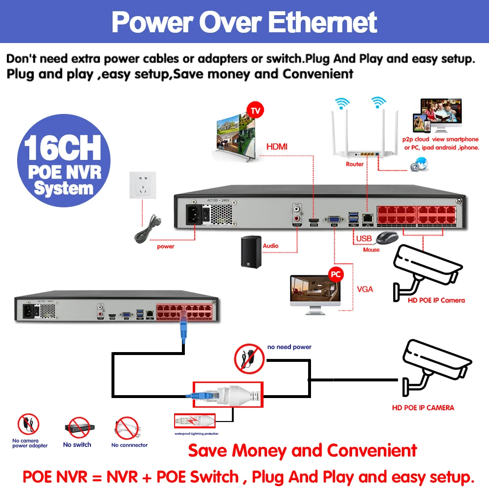 Нет дополнительных кабелей питания или адаптеров, просто подключив ip-камеру к NVR с помощью одного кабеля, вы можете легко завершить установку без знания о компьютере или сети и начать наслаждаться супер простым мониторингом среди вашего смартфона, планшета или ПК.Экономьте деньги и удобный POE NVR = NVR + POE коммутатор, подключи и работай и простая настройка!