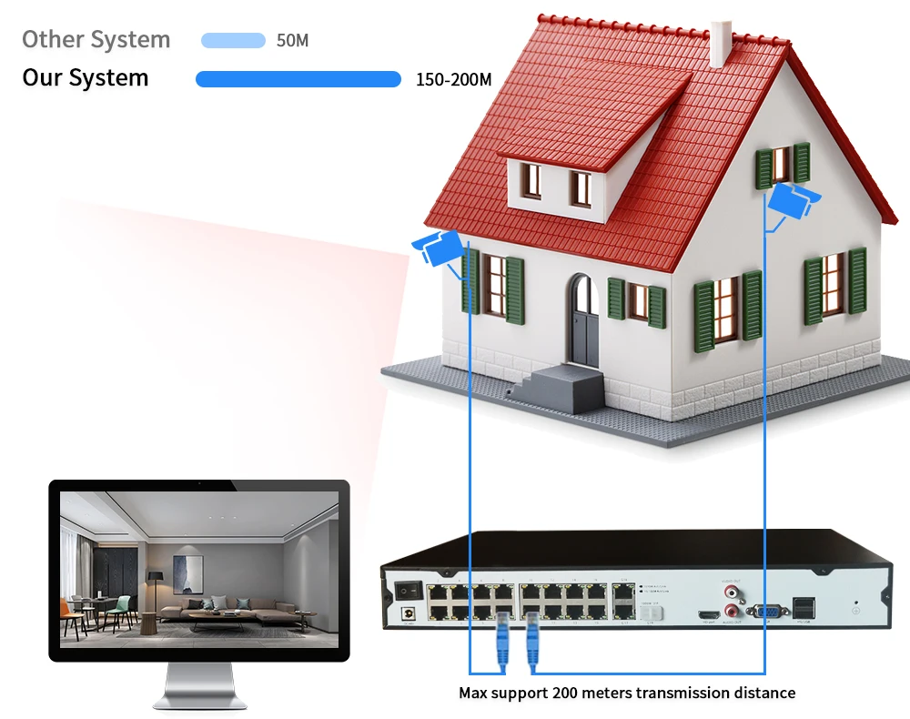 Максимальная поддержка POE 150 м-200 м расстояние передачи кабелей POE, что значительно увеличивает удобство домашней установки.