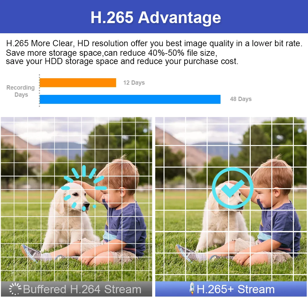 H.265 более четкий, HD разрешение предлагает вам лучшее качество изображения в более низкой скорости. Экономьте больше места для хранения, вы можете уменьшить размер файлов 40%-50%, сэкономить место для хранения HDD и снизить стоимость покупки.