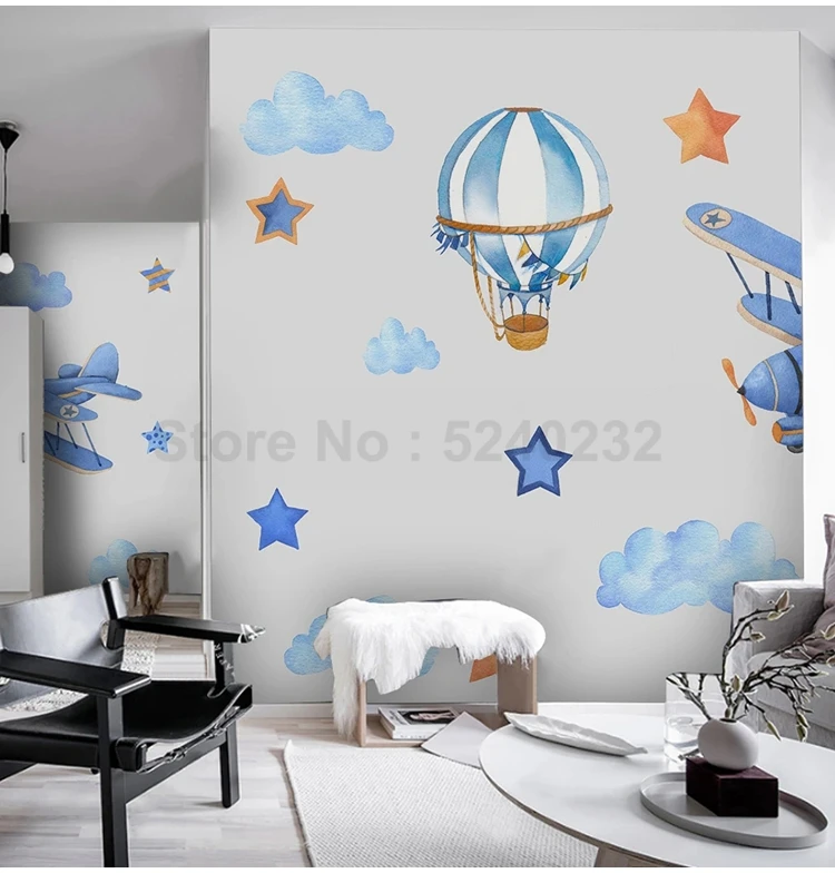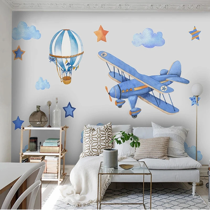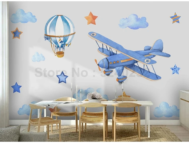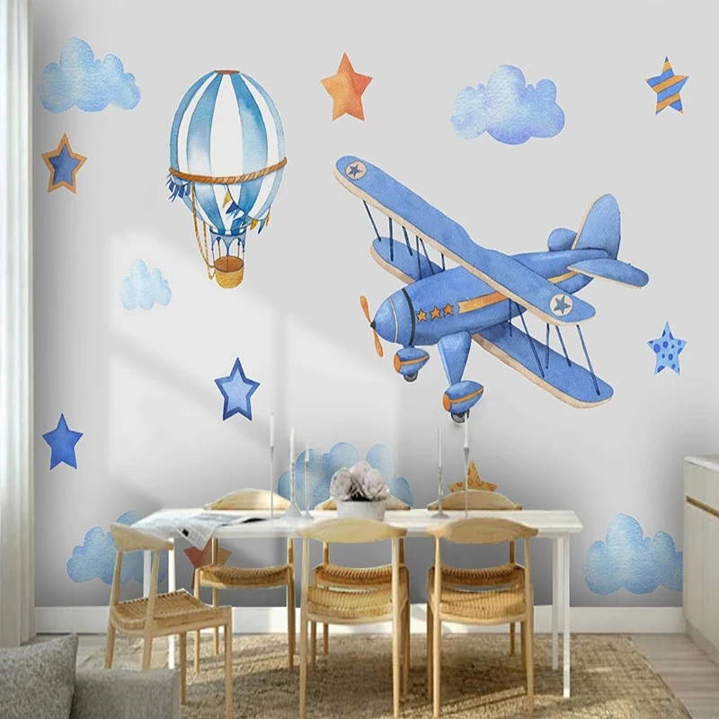 Настенная роспись на заказ, 3D Ручная роспись, мультфильм, воздушный шар, самолет, детская комната, фон, фотобумага
