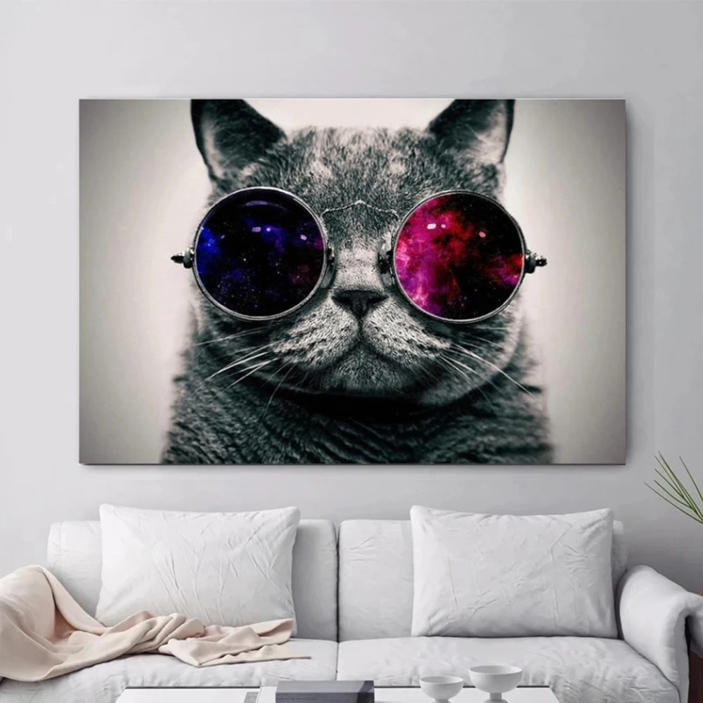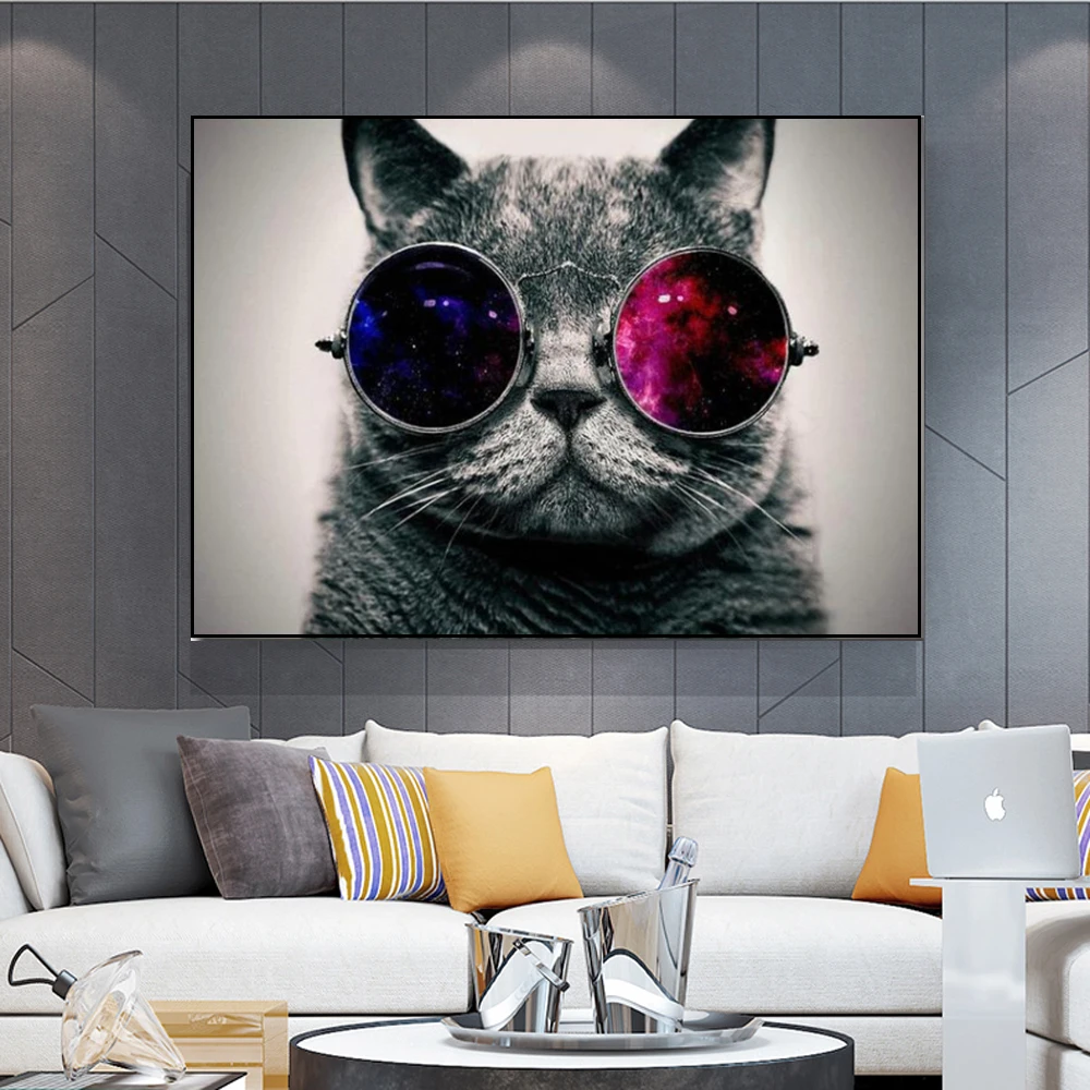 Очки, кошка, забавное искусство, холст, картина, постер, принт кошки с очками, галактические картины для гостиной, украшение для дома, без рамки