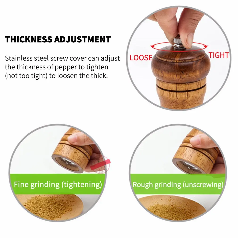 3. Эффективное шлифование: деревянная ручка чрезвычайно эффективна. Шлифовальная машина для перца дуба полностью регулируется. Открутите крышку, вставьте специи и закройте крышку. (Затягивание означает грубое, ослабление означает хорошее)