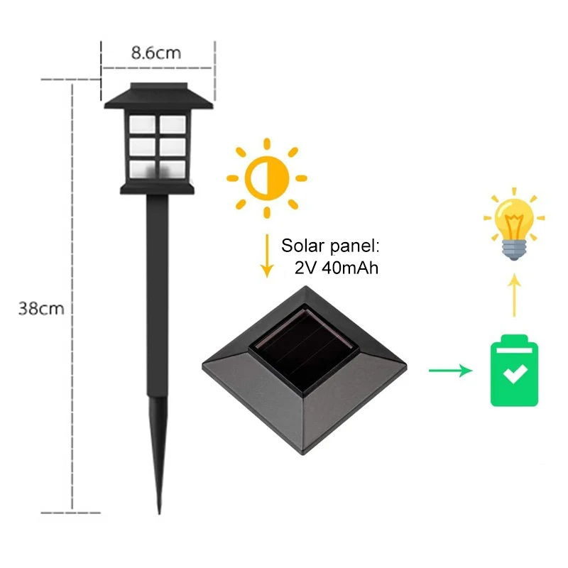 1. Легко установить, включить переключатель под крышкой и нажать на кол в почву. Эти солнечные огни автоматически включаются ночью и выключаются на рассвете. 2. Премиум Открытый Декор, эти наружные садовые огни могут быть легко украшены и добавить восхитительное свечение к вашей подъездной дорожке, патио или цветам. 3. Энергосбережение, не требуется электричество; Поглощает солнечный свет для зарядки. Светодиодный светильник, заряжаемый от солнечного света в течение 6-8 часов, может обеспечить 8-10 часов освещения. 4. Устойчивость к погодным условиям, подходит для использования на улице, не беспокойтесь о дожде, снегу, морозе или санях. Параметры Материал: АБС-пластик + Поликарбонат Размер: 8,6x38 см Источник питания: Встроенный аккумулятор 600 мАч Время зарядки: 6-8 часов Время работы: 6-8 часов Переключатель: выключение/включение, автоматический светильник с чувствительной функцией Водонепроницаемость: IP65 Солнечная панель: 2 в 40 мАч Светильник Цвет: белый/теплый белый (по желанию) Пожалуйста, обратите внимание 1. Если светильник не работает при первом использовании, включите светильник, а затем поместите его под солнце в течение 6-12 часов. Светильник должен работать снова после его перезарядки.2. Шипы ламп перевернуты в трубу. Пожалуйста, вытяните их перед первым использованием!