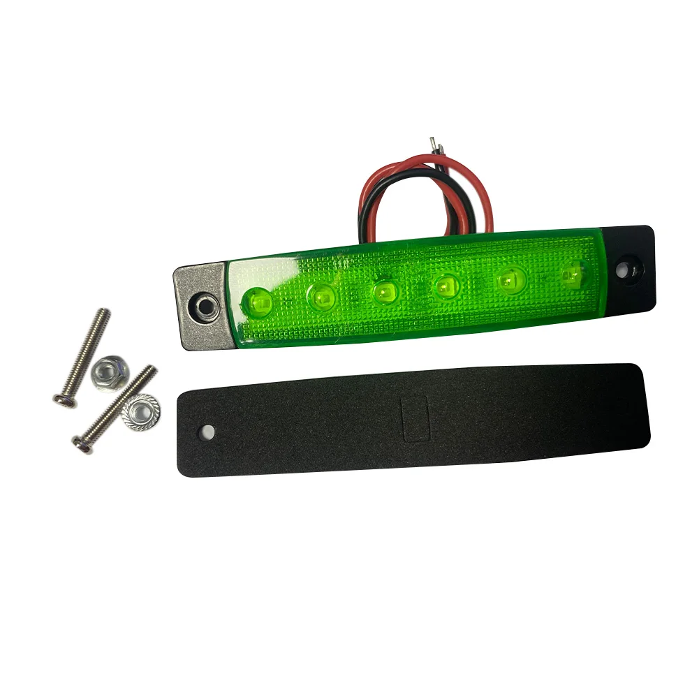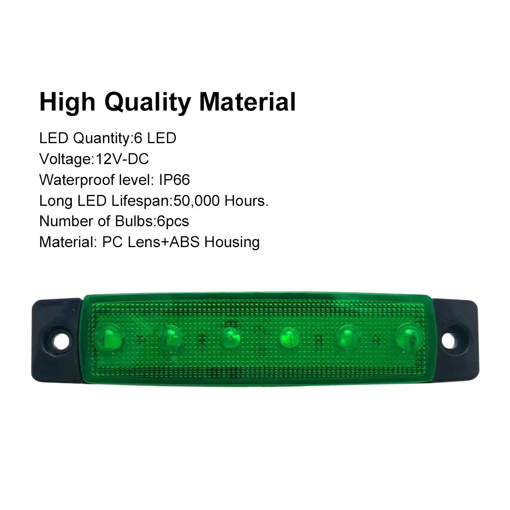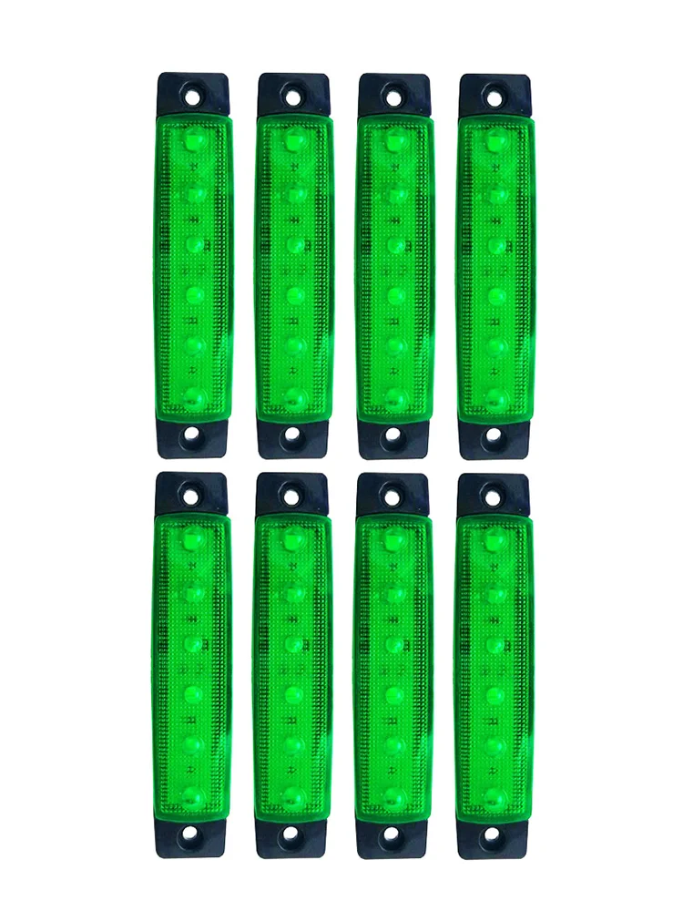 Особенности:* 1. 100% Новый бренд* 2. Низкая мощность и потребление тока-долгий срок службы светодиодный.* 3. Водонепроницаемый и пылезащитный.* 4. Встроенный 6 светодиодов.* 5. Подходит для грузовых автомобилей, тяжелых грузовиков, прицепов, автобусов и т. д.* 6. Проводка: красный-положительный, черный-отрицательный.Описание:* 1. Материал корпуса: поликарбонат* 2. Напряжение: 12 В* 3. Светильник Цвет: зеленый* 4. Срок службы: 50000 часов* 5. Количество светодиодов: 6* 6. Длина: 95 мм* 7. Ширина: 20 мм* 8. Кол-во: 8 шт./компл.Список:1 комплект х боковые габаритные огниПримечание:Цвет изделия может незначительно отличаться из-за различий в настройках мониторов.