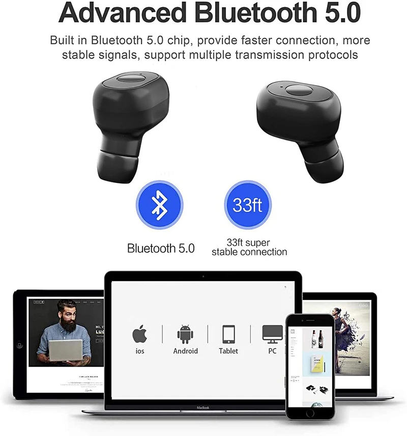 Описание:Особенности:Наушники Wireless имеют чип Bluetooth 5,0, который обеспечивает быстрое стабильное соединение.С эргономичным дизайном, удобно носить.Благодаря компактному размеру его легко носить с собой.Характеристики:Спецификация:Название товара: беспроводные наушникиМатериал: АБС-пластикВерсия Bluetooth: 5,0 + EDRЕмкость аккумулятора наушников: 40 мАч (в комплекте)Напряжение зарядки: 5 В постоянного токаРасстояние передачи: 10 мВремя работы в режиме разговора: 3-4 часаВремя воспроизведения музыки: 3-4 часаВремя зарядки наушников: около 1 часаВходной ток: 5 В 1A (TYP)Емкость Зарядки: 350 мАч (в комплекте)Зарядным устройством Время зарядки: около 1,5 часовХарактеристики: беспроводной, перезаряжаемый, портативныйЗарядным устройством Размеры: 7 см x 4 см x 3 см/2,76 "x 1,57" x 1,18 "(прибл.)Посылка включает в себя:Беспроводные наушники-2 шт.1 x Зарядное устройство1 x зарядный кабель1 x Руководство пользователя