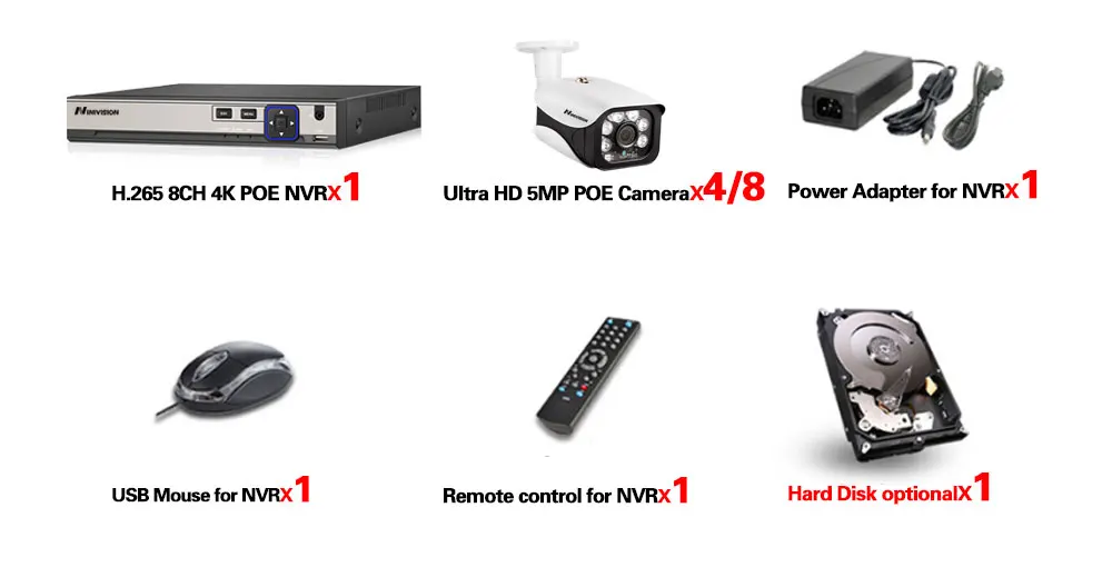1 сетевой видеорегистратор 8CH 4K POE NVR;4/8 X HD POE IP 5.0MP Крытый Открытый ИК День ночного видения атмосферостойкие камеры;1 X Блок питания для NVR;1 х USB мышь для NVR;1 компакт-диск программного обеспечения для NVR;1 пульт дистанционного управления для NVR;Жесткий диск опционально!