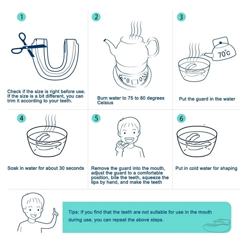 Формирование и использование1. Вы можете подрезать подтяжки до нужного размера в соответствии с вашей собственной формой.2. Замочите подтяжки в горячей воде около 75 градусов в течение 10 секунд, чтобы сделать подтяжки мягкими.3. Положите его в рот пользователя и аккуратно прижмите защитника верхними и нижними зубьями (не кусайте слишком глубоко).4. В течение этого периода Крепко держите руку и язык, Поддерживайте в течение полуминуты, затем положите в холодную воду в течение 10 секунд, чтобы полностью придать форму, а затем остыть холодной водой.5. После каждого использования брекетов промойте и высушите водой и положите их в коробку.Примечание: Перед каждым использованием, вы должны формировать в соответствии с вашей собственной формой зуба; Потому что форма зуба каждого человека отличается, для того, чтобы достичь хорошего комфорта и защитного эффекта; необходимо сочетать брекеты с собственной формой зуба, специально для смягчения брекетов после этого, Наденьте его на верхние зубы; Вытрите или сожмите вручную; Сделайте его подходящим для зубов, размер можно отрегулировать самостоятельно, пожалуйста, не кусайте зубы, когда зажат пузырчатый рукав, он укусит подтяжки! Установка температуры воды должна быть 70-80 градусов, и время замачивания не должно превышать 10 секунд; Не используйте кипяченую воду или кипяток непосредственно в диспенсере для воды, В противном случае подтяжки будут замачиваться и не могут быть использованы; Если эффект формирования не является хорошим, настройка может быть повторена. Пока не будет доволен. Фигурные скобы не могут быть скошены на зубах, то есть слишком туго.