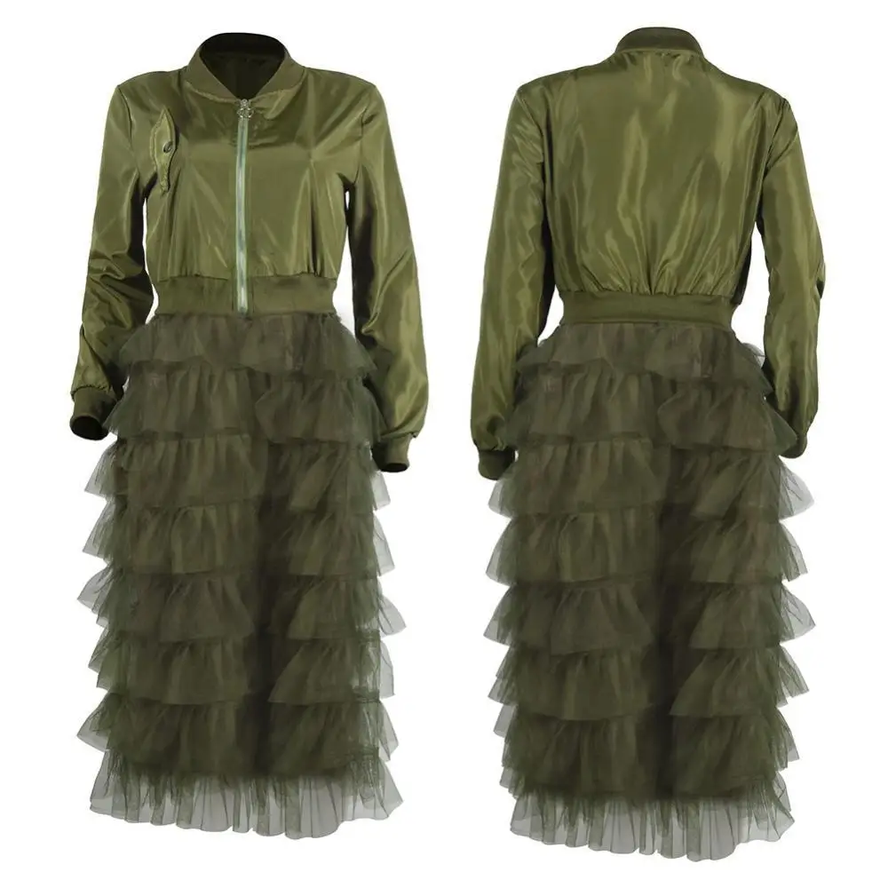 Дропшиппинг, модная женская осенняя куртка на молнии с длинным рукавом, кружевное сетчатое платье-миди, пальто
