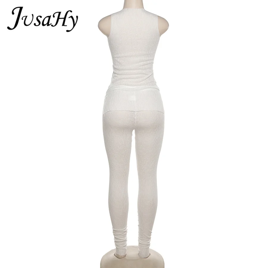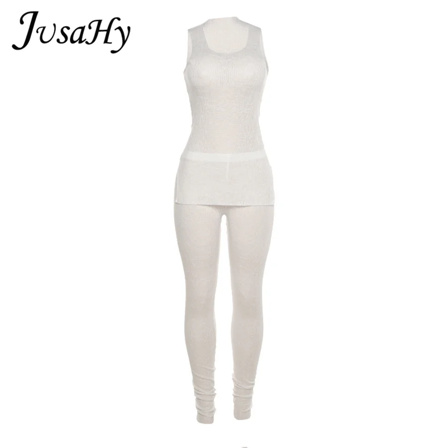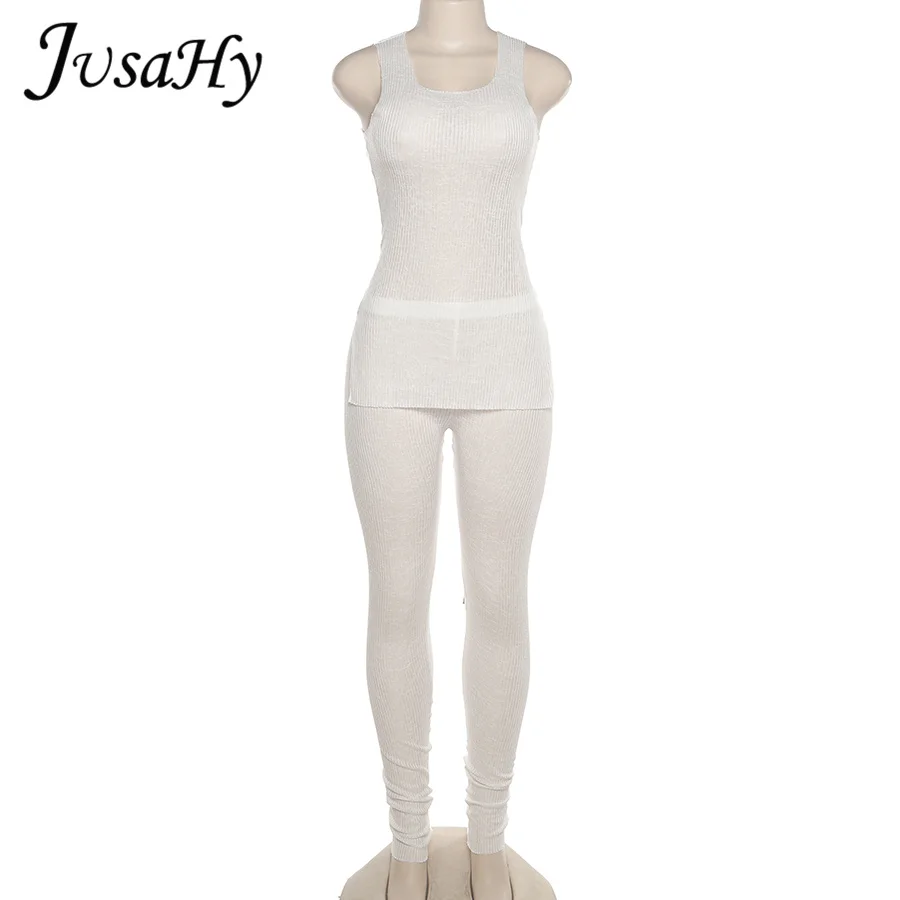 Женский комплект из двух предметов JuSaHy, вязаный однотонный топ без рукавов с разрезом и брюки с высокой талией, тонкий летний спортивный костюм, Повседневная Уличная одежда
