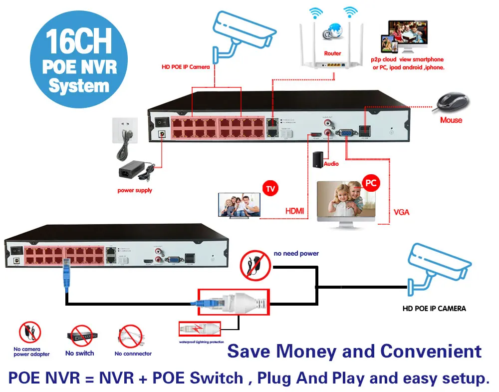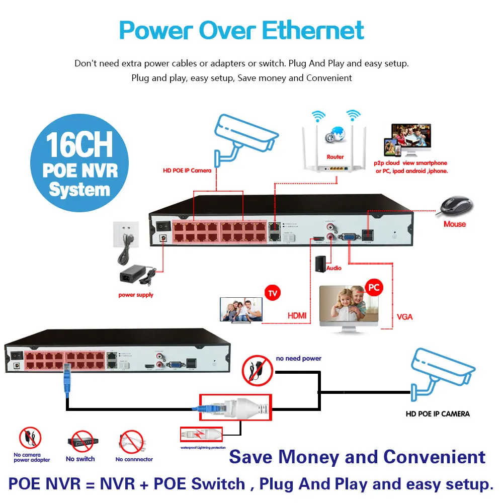 Никаких дополнительных силовых кабелей или адаптеров не требуется, просто подключив IP-камеру к сетевому видеорегистраторУ с помощью одного кабеля, вы можете легко завершить установку, не зная о компьютере или сети, и начать наслаждаться супер легким мониторингом среди вашего смартфона, планшета или ПК.Экономьте деньги и удобный POE NVR = переключатель NVR + POE, подключи и работай, простая настройка!