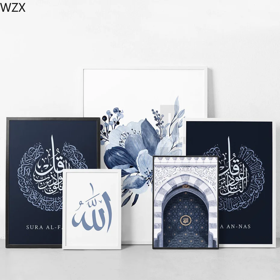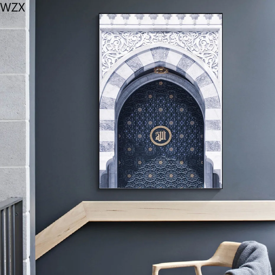 Художественная печать на холсте с изображением синей цветочной мечети двери Исламской стены, картины, каллиграфия и картины для гостиной, домашние Декоративные плакаты
