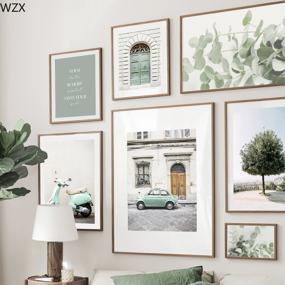 Ретро автомобиль Vespa классический мотоцикл зеленые листья настенная живопись на холсте и принты настенные картины для гостиной в скандинавском стиле постеры