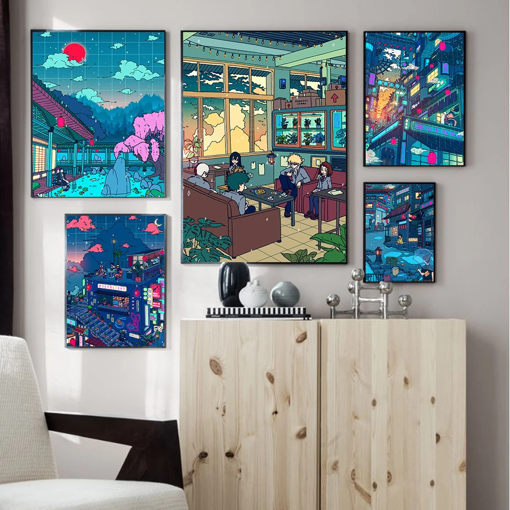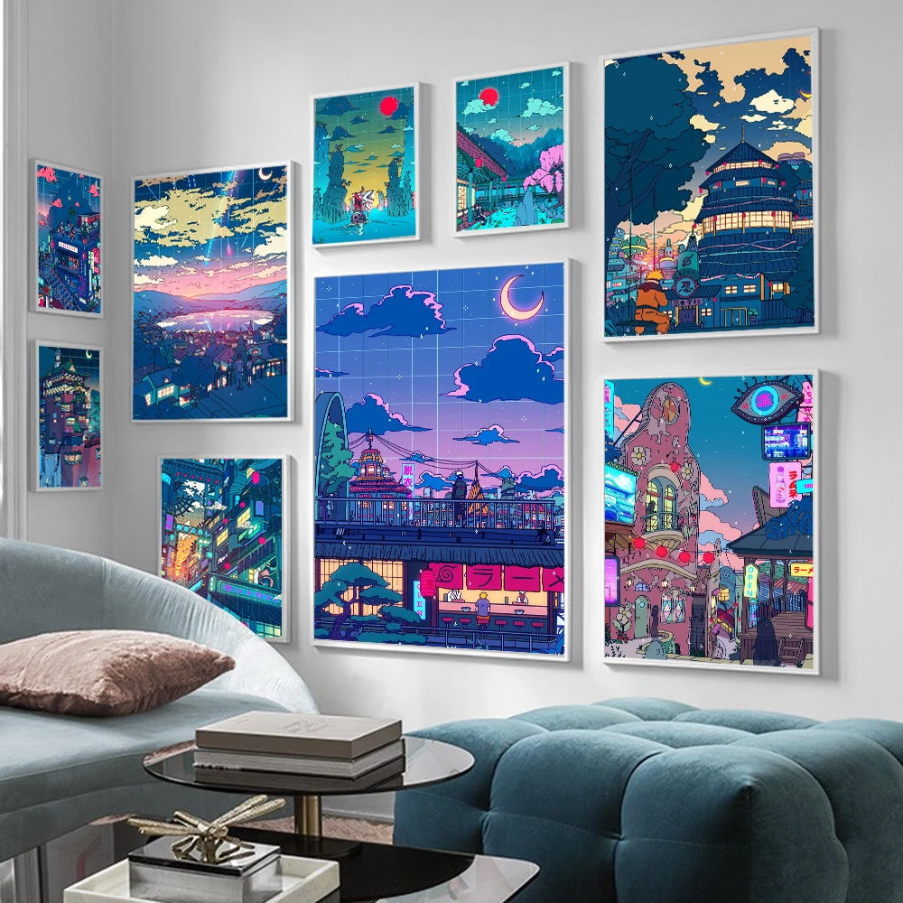 Уличный пейзаж, фиолетовый абстрактный постер, мультфильм, аниме, п...