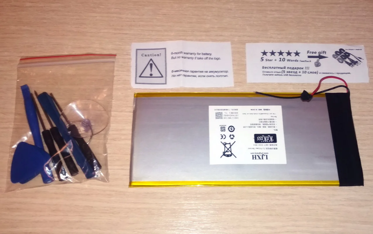 Аккумулятор дошел, внешне всё в порядке, пока не установлен в планшет, вольтметр показывает на контактах 3,8 Вольт. На задней стенке двусторонний скотч от фирмы 3M. В подарок набор инструментов для сборки-разборки телефонов и планшетов. Благодарю!
