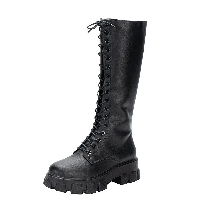 Женские высокие ботинки из ПУ кожи, на шнуровке, до середины икры