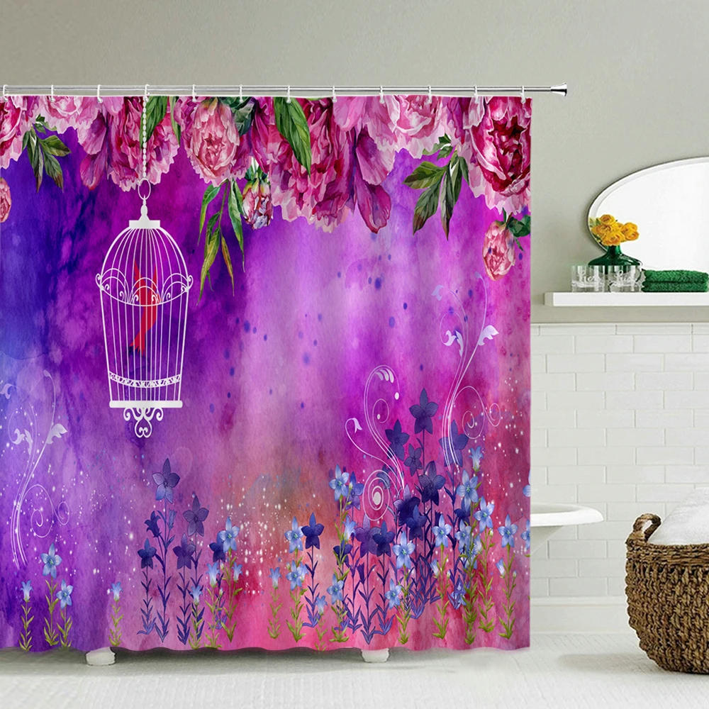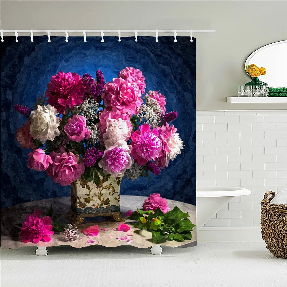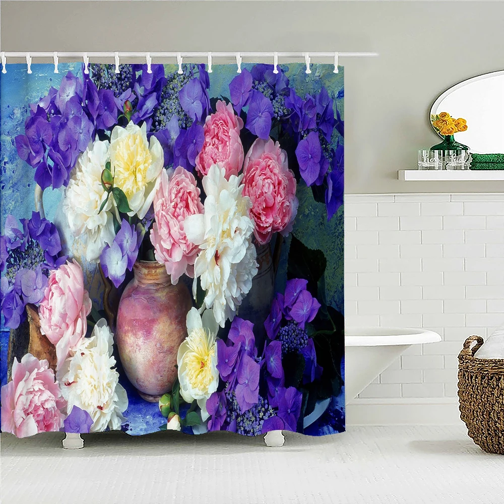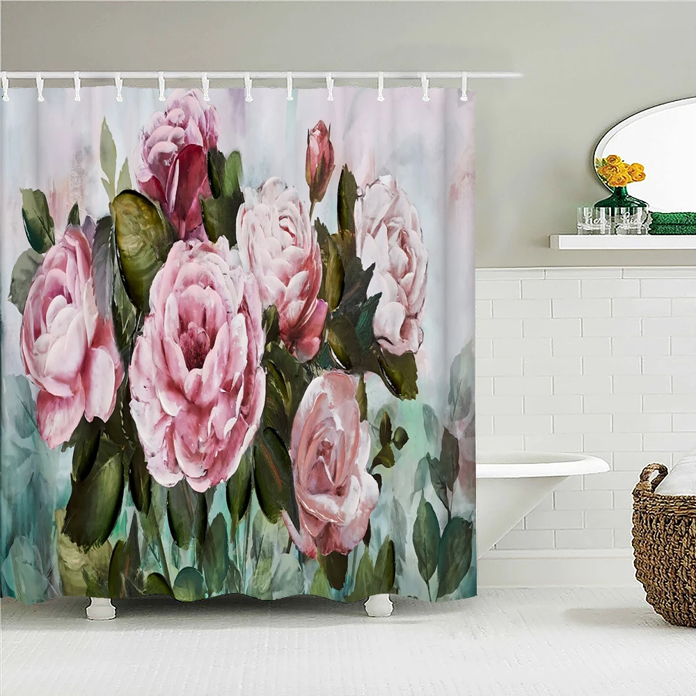 Цветные цветы, занавески для душа, занавески для ванной, Европейский ретро цветок, водонепроницаемая ткань, декор для ванной с крючками